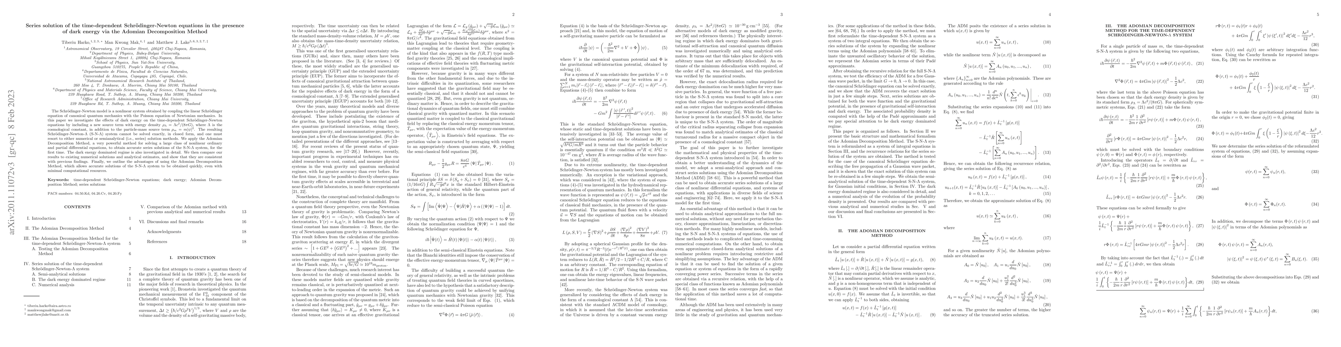 The Schr\"{o}dinger-Newton model is a nonlinear system obtained by coupling the linear Schr\"{o}dinger equation of canonical quantum mechanics with the Poisson equation of Newtonian mechanics. In this paper we investigate the effects of dark energy on the time-dependent Schr\"{o}dinger-Newton equations by including a new source term with energy density $\rho_{\Lambda} = \Lambda c^2/(8\pi G)$, where $\Lambda$ is the cosmological constant, in addition to the particle-mass source term $\rho_m = m|\psi|^2$. The resulting Schr\"{o}dinger-Newton-$\Lambda$ (S-N-$\Lambda$) system cannot be solved exactly, in closed form, and one must resort to either numerical or semianalytical (i.e., series) solution methods. We apply the Adomian Decomposition Method, a very powerful method for solving a large class of nonlinear ordinary and partial differential equations, to obtain accurate series solutions of the S-N-$\Lambda$ system, for the first time. The dark energy dominated regime is also investigated in detail. We then compare our results to existing numerical solutions and analytical estimates, and show that they are consistent with previous findings. Finally, we outline the advantages of using the Adomian Decomposition Method, which allows accurate solutions of the S-N-$\Lambda$ system to be obtained quickly, even with minimal computational resources.