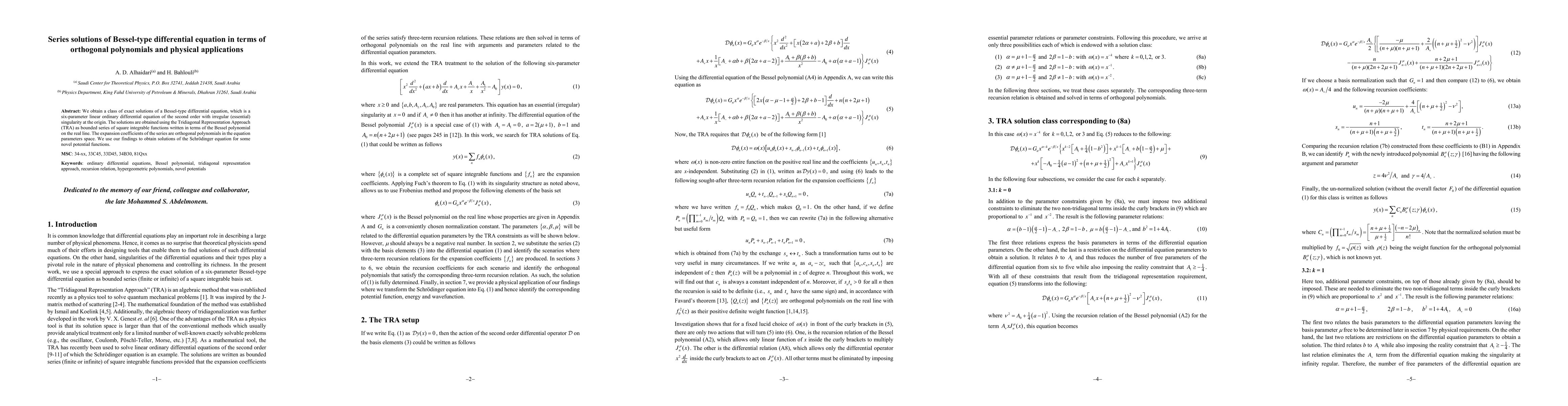 This paper presents exact solutions to a Bessel-type differential equation using the Tridiagonal Representation Approach (TRA), expressed as bounded series in Bessel polynomials. The solutions involve orthogonal polynomials and are applied to solve the Schrödinger equation for new potential functions.