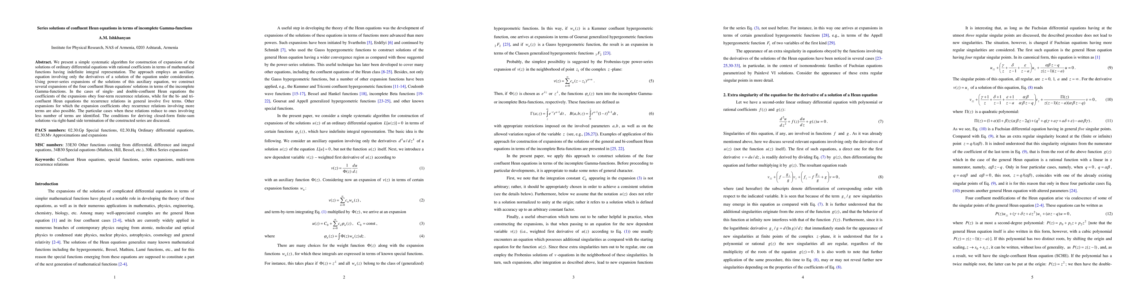We present a simple systematic algorithm for construction of expansions of the solutions of ordinary differential equations with rational coefficients in terms of mathematical functions having indefinite integral representation. The approach employs an auxiliary equation involving only the derivatives of a solution of the equation under consideration. Using power-series expansions of the solutions of this auxiliary equation, we construct several expansions of the four confluent Heun equations' solutions in terms of the incomplete Gamma-functions. In the cases of single- and double-confluent Heun equations the coefficients of the expansions obey four-term recurrence relations, while for the bi- and tri-confluent Heun equations the recurrence relations in general involve five terms. Other expansions for which the expansion coefficients obey recurrence relations involving more terms are also possible. The particular cases when these relations reduce to ones involving less number of terms are identified. The conditions for deriving closed-form finite-sum solutions via right-hand side termination of the constructed series are discussed.