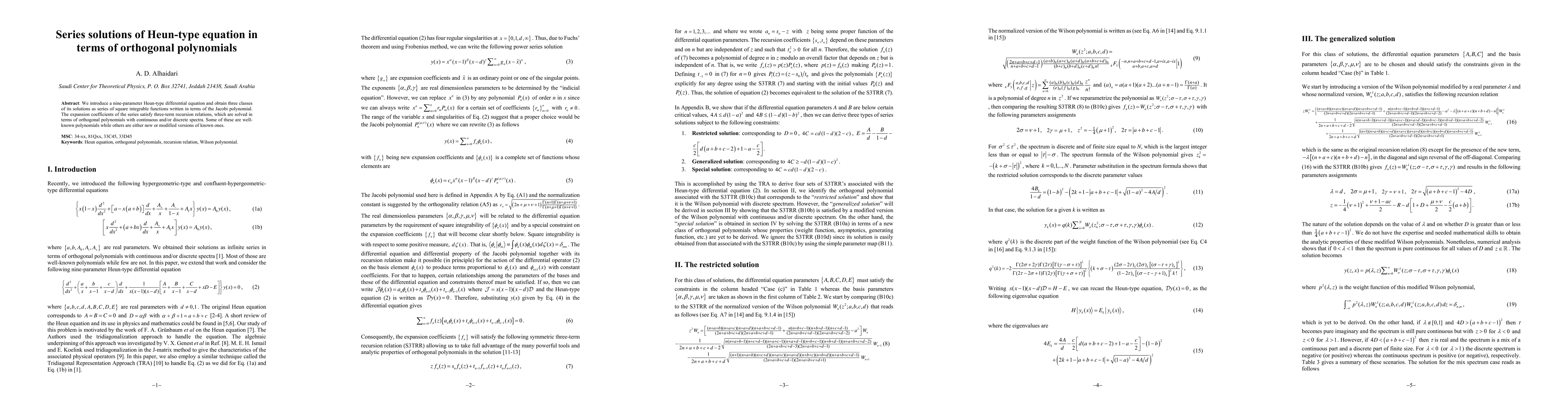 We introduce a nine-parameter Heun-type differential equation and obtain three classes of its solutions as series of square integrable functions written in terms of the Jacobi polynomial. The expansion coefficients of the series satisfy three-term recursion relations, which are solved in terms of orthogonal polynomials with continuous and/or discrete spectra. Some of these are well-known polynomials while others are either new or modified versions of known ones.