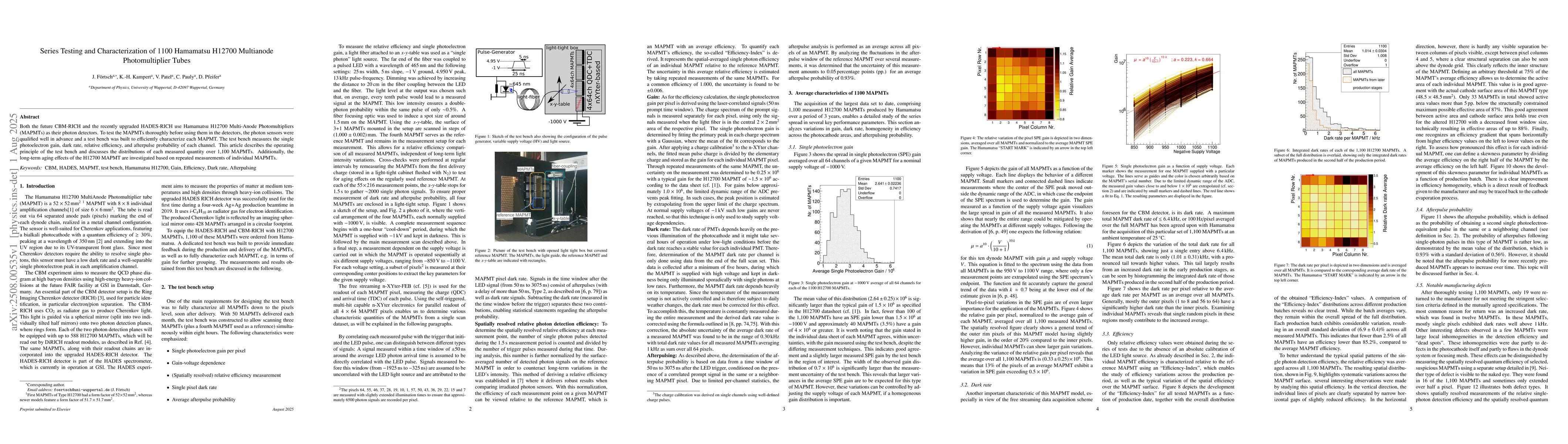 Both the future CBM-RICH and the recently upgraded HADES-RICH use Hamamatsu H12700 Multi-Anode Photomultipliers (MAPMTs) as their photon detectors. To test the MAPMTs thoroughly before using them in the detectors, the photon sensors were qualified well in advance and a test bench was built to efficiently characterize each MAPMT. The test bench measures the single photoelectron gain, dark rate, relative efficiency, and afterpulse probability of each channel. This article describes the operating principle of the test bench and discusses the distributions of each measured quantity over 1,100 MAPMTs. Additionally, the long-term aging effects of the H12700 MAPMT are investigated based on repeated measurements of individual MAPMTs.