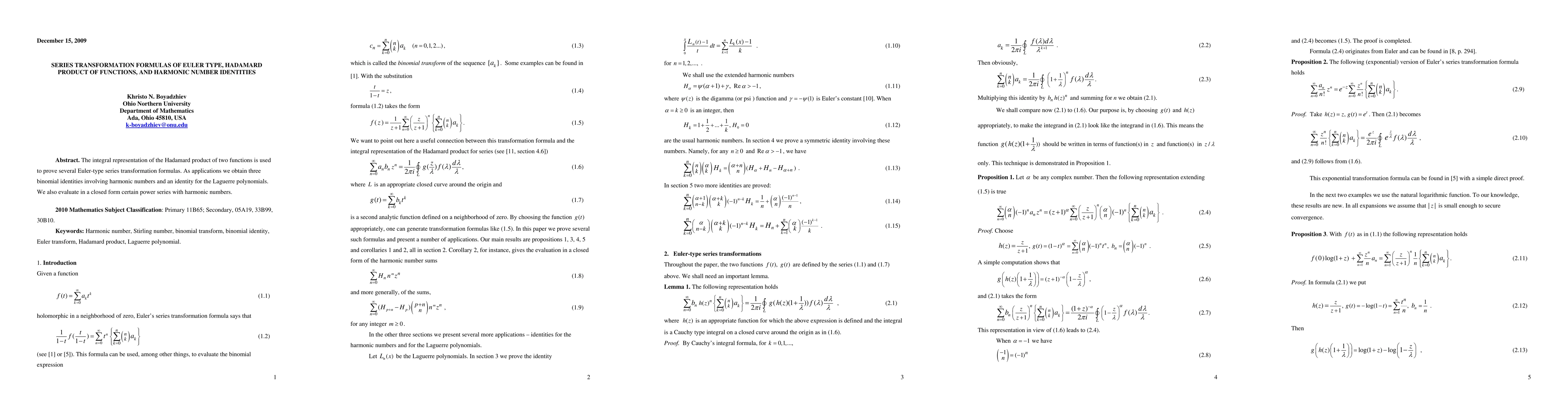 The integral representation of the Hadamard product of two functions is used to prove several Euler-type series transformation formulas. As applications we obtain three binomial identities involving harmonic numbers and an identity for the Laguerre polynomials. We also evaluate in a closed form certain power series with harmonic numbers