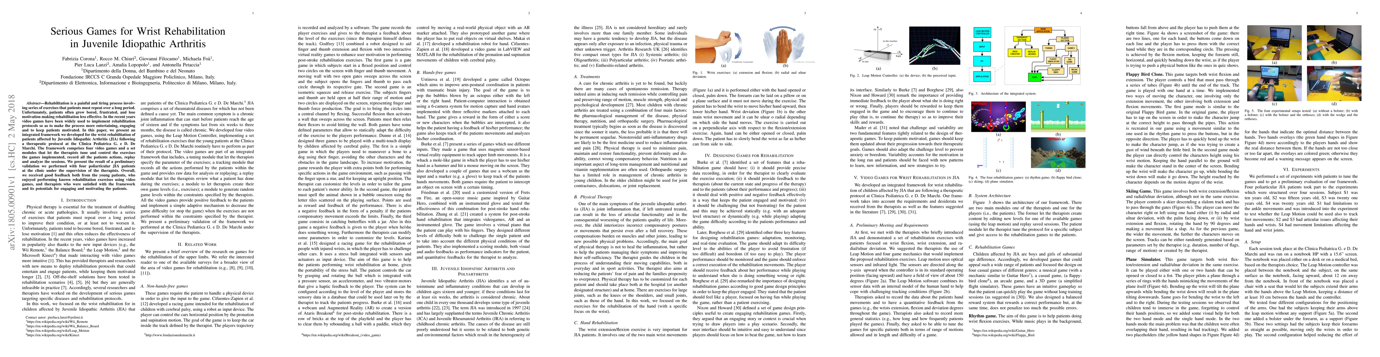 Rehabilitation is a painful and tiring process involving series of exercises that patients must repeat over a long period. Unfortunately, patients often grow bored, frustrated, and lose motivation making rehabilitation less effective. In the recent years video games have been widely used to implement rehabilitation protocols so as to make the process more entertaining, engaging and to keep patients motivated. In this paper, we present an integrated framework we developed for the wrist rehabilitation of patients affected by Juvenile Idiopathic Arthritis (JIA) following a therapeutic protocol at the Clinica Pediatrica G. e D. De Marchi. The framework comprises four video games and a set modules that let the therapists tune and control the exercises the games implemented, record all the patients actions, replay and analyze the sessions. We present the result of a preliminary validation we performed with four poliarticular JIA patients at the clinic under the supervision of the therapists. Overall, we received good feedback both from the young patients, who enjoyed performing known rehabilitation exercises using video games, and therapists who were satisfied with the framework and its potentials for engaging and motivating the patients.