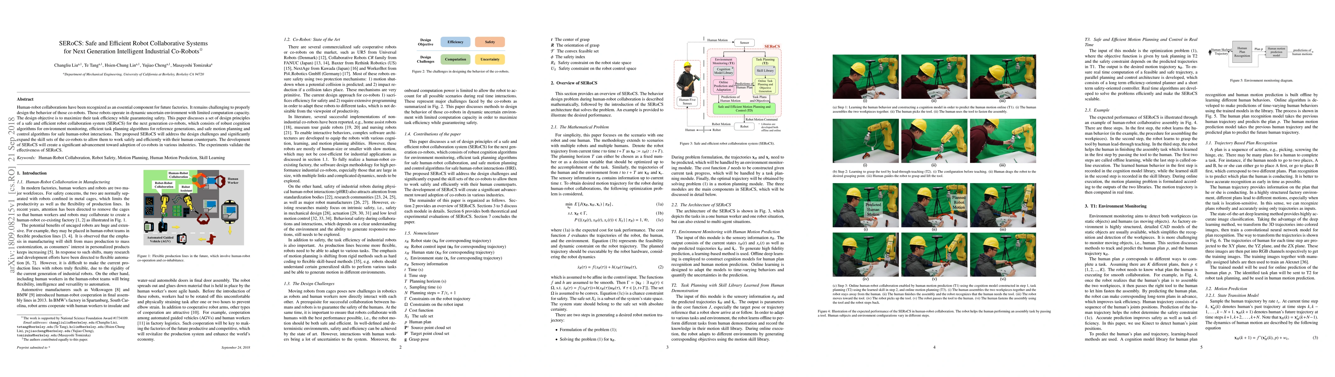 This paper proposes a safe and efficient robot collaborative system (SERoCS) for next-generation co-robots, featuring robust cognition, efficient task planning, and safe motion planning algorithms to enhance human-robot collaboration in industrial settings. Experiments validate SERoCS's effectiveness in addressing design challenges and improving co-robots' operational capabilities.