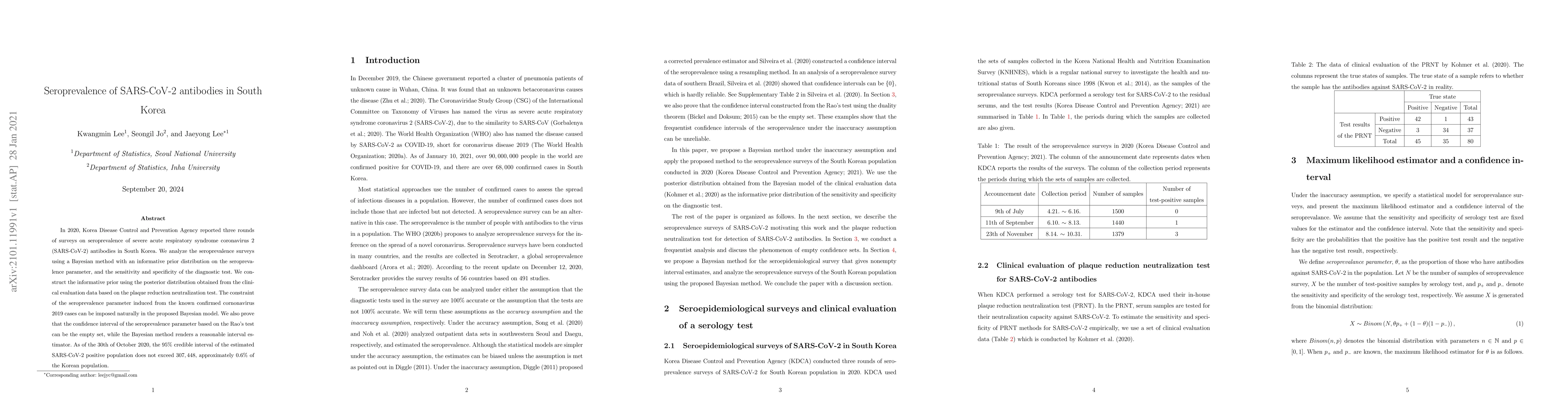 In $2020$, Korea Disease Control and Prevention Agency reported three rounds of surveys on seroprevalence of severe acute respiratory syndrome coronavirus 2 (SARS-CoV-2) antibodies in South Korea. We analyze the seroprevalence surveys using a Bayesian method with an informative prior distribution on the seroprevalence parameter, and the sensitivity and specificity of the diagnostic test. We construct the informative prior using the posterior distribution obtained from the clinical evaluation data based on the plaque reduction neutralization test. The constraint of the seroprevalence parameter induced from the known confirmed coronavirus 2019 cases can be imposed naturally in the proposed Bayesian model. We also prove that the confidence interval of the seroprevalence parameter based on the Rao's test can be the empty set, while the Bayesian method renders a reasonable interval estimator. As of the $30$th of October $2020$, the $95\%$ credible interval of the estimated SARS-CoV-2 positive population does not exceed $307,448$, approximately $0.6\%$ of the Korean population.