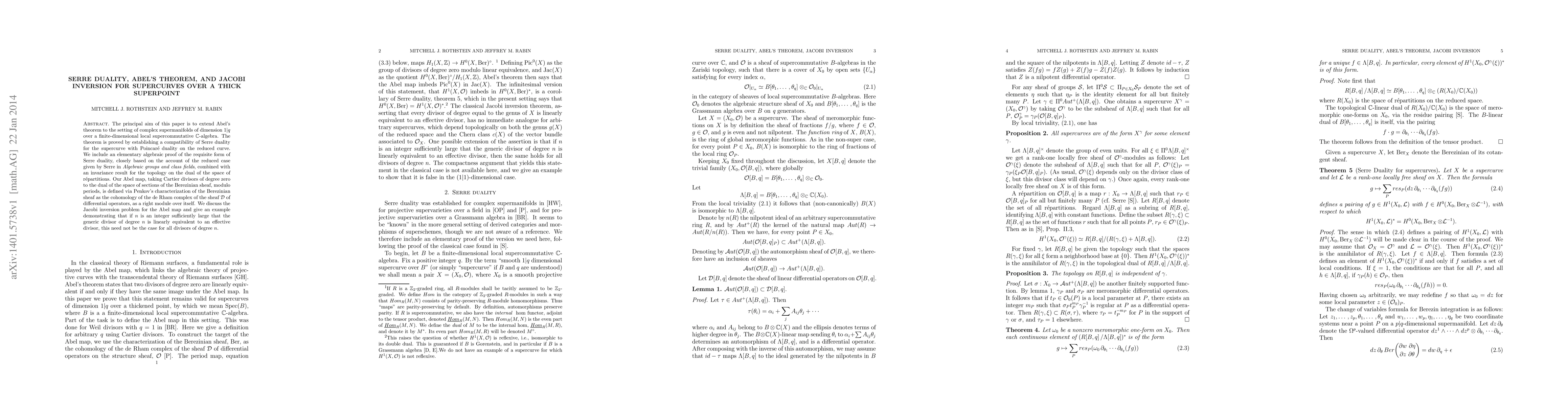 The principal aim of this paper is to extend Abel's theorem to the setting of complex supermanifolds of dimension 1|q over a finite-dimensional local supercommutative C-algebra. The theorem is proved by establishing a compatibility of Serre duality for the supercurve with Poincare duality on the reduced curve. We include an elementary algebraic proof of the requisite form of Serre duality, closely based on the account of the reduced case given by Serre in Algebraic Groups and Class Fields, combined with an invariance result for the topology on the dual of the space of repartitions. Our Abel map, taking Cartier divisors of degree zero to the dual of the space of sections of the Berezinian sheaf, modulo periods, is defined via Penkov's characterization of the Berezinian sheaf as the cohomology of the de Rham complex of the sheaf D of differential operators, as a right module over itself. We discuss the Jacobi inversion problem for the Abel map and give an example demonstrating that if n is an integer sufficiently large that the generic divisor of degree n is linearly equivalent to an effective divisor, this need not be the case for all divisors of degree n.