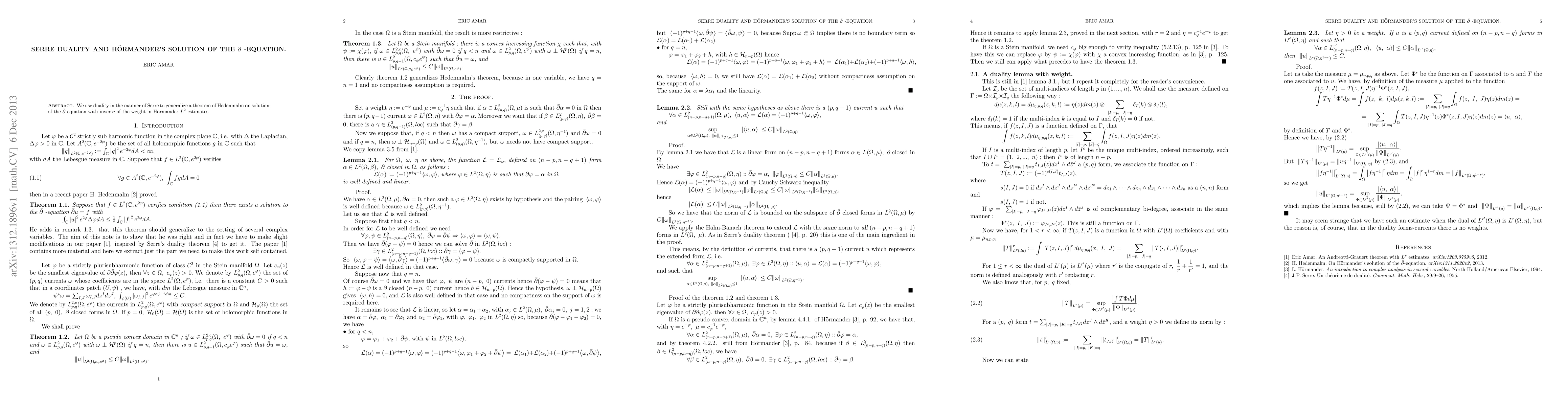 We use duality in the manner of Serre to generalize a theorem of Hedenmalm on solution of the $\bar \partial $ equation with inverse of the weight in H\"ormander $\displaystyle L^{2}$ estimates.\