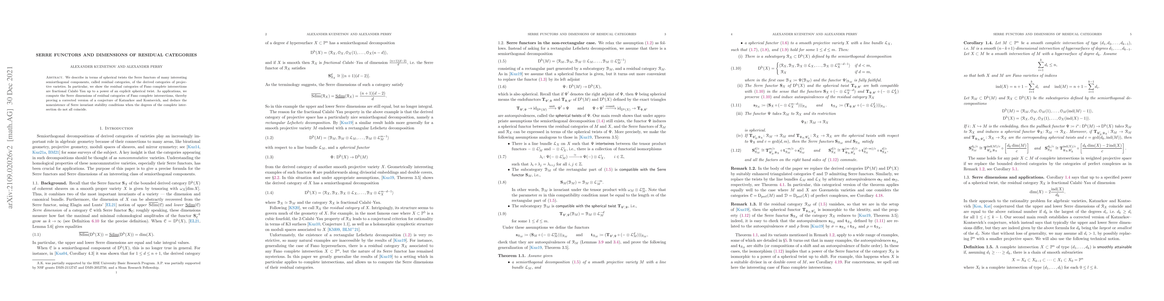 This paper describes Serre functors of residual categories in derived categories of projective varieties using spherical twists, proving Fano complete intersections are fractional Calabi-Yau up to a twist. It also corrects a conjecture by Katzarkov and Kontsevich regarding the Serre dimensions of these categories and deduces the nonexistence of Serre invariant stability conditions for non-uniform degrees.