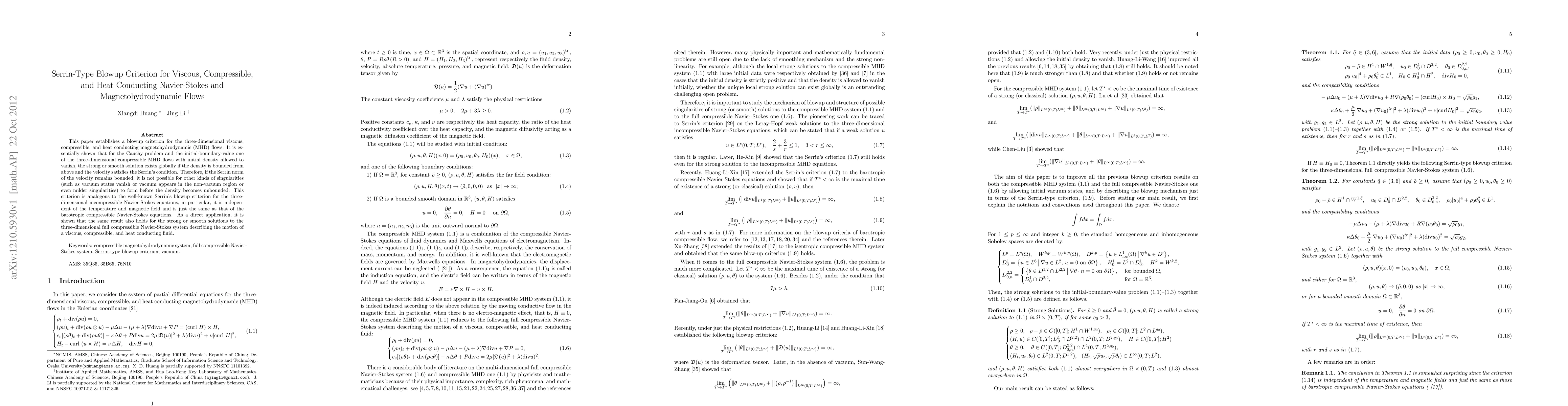 This paper establishes a Serrin-type blowup criterion for three-dimensional viscous, compressible, and heat conducting magnetohydrodynamic flows, showing that solutions remain globally smooth if the density is bounded above and velocity satisfies Serrin's condition. The criterion is analogous to that for incompressible Navier-Stokes equations and applies similarly to the compressible Navier-Stokes system.