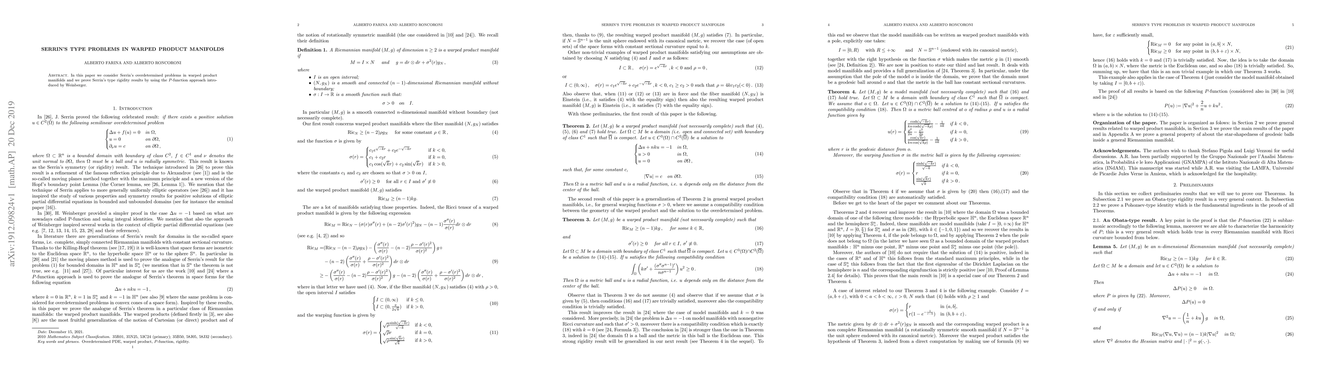 Summary: This paper investigates Serrin's overdetermined problems within warped product manifolds and establishes Serrin's type rigidity results utilizing Weinberger's P-function approach. The findings contribute to the understanding of geometric analysis in these complex manifolds.