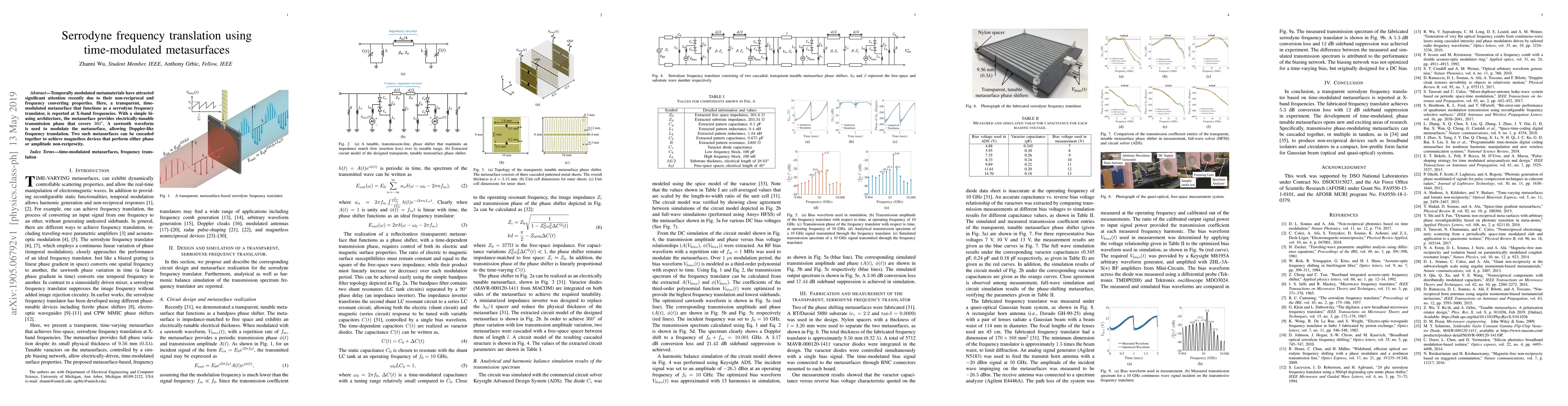 This paper reports on a transparent, time-modulated metasurface functioning as a serrodyne frequency translator at X-band frequencies. The metasurface uses a sawtooth waveform to achieve Doppler-like frequency translation and can be cascaded to create magnetless devices with phase or amplitude non-reciprocity.