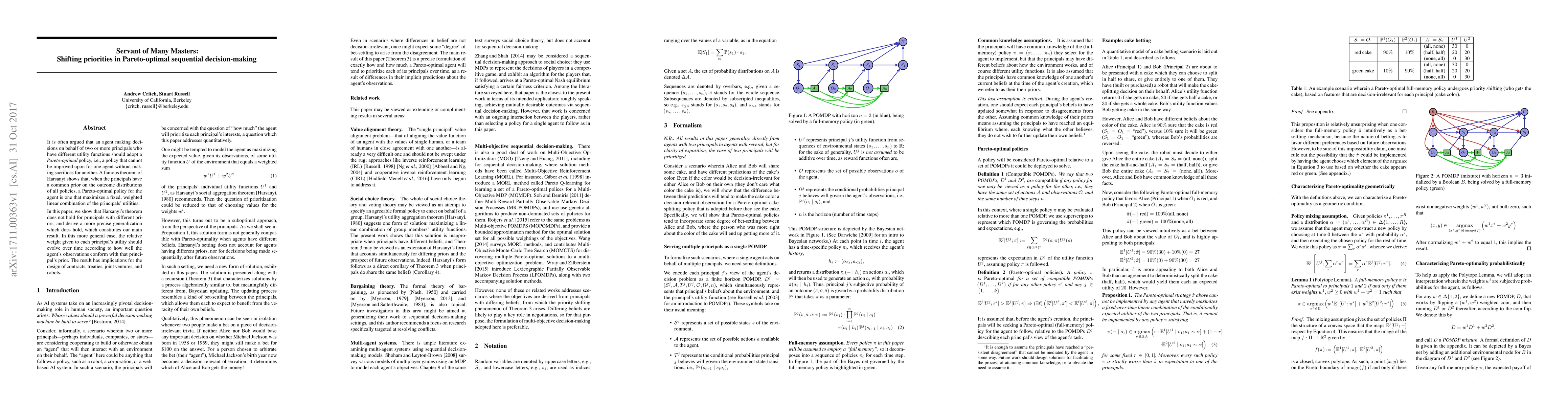 It is often argued that an agent making decisions on behalf of two or more principals who have different utility functions should adopt a {\em Pareto-optimal} policy, i.e., a policy that cannot be improved upon for one agent without making sacrifices for another. A famous theorem of Harsanyi shows that, when the principals have a common prior on the outcome distributions of all policies, a Pareto-optimal policy for the agent is one that maximizes a fixed, weighted linear combination of the principals' utilities. In this paper, we show that Harsanyi's theorem does not hold for principals with different priors, and derive a more precise generalization which does hold, which constitutes our main result. In this more general case, the relative weight given to each principal's utility should evolve over time according to how well the agent's observations conform with that principal's prior. The result has implications for the design of contracts, treaties, joint ventures, and robots.