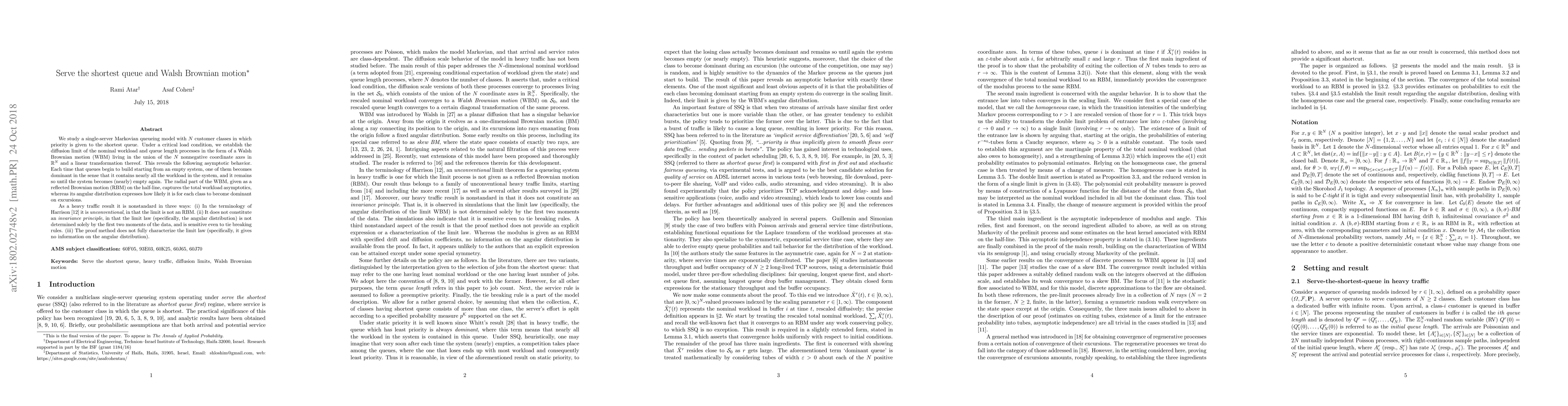 We study a single-server Markovian queueing model with $N$ customer classes in which priority is given to the shortest queue. Under a critical load condition, we establish the diffusion limit of the workload and queue length processes in the form of a Walsh Brownian motion (WBM) living in the union of the $N$ nonnegative coordinate axes in $\mathbb{R}^N$ and a linear transformation thereof. This reveals the following asymptotic behavior. Each time that queues begin to build starting from an empty system, one of them becomes dominant in the sense that it contains nearly all the workload in the system, and it remains so until the system becomes (nearly) empty again. The radial part of the WBM, given as a reflected Brownian motion (RBM) on the half-line, captures the total workload asymptotics, whereas its angular distribution expresses how likely it is for each class to become dominant on excursions. As a heavy traffic result it is nonstandard in three ways: (i) In the terminology of Harrison (1995) it is unconventional, in that the limit is not an RBM. (ii) It does not constitute an invariance principle, in that the limit law (specifically, the angular distribution) is not determined solely by the first two moments of the data, and is sensitive even to tie breaking rules. (iii) The proof method does not fully characterize the limit law (specifically, it gives no information on the angular distribution).