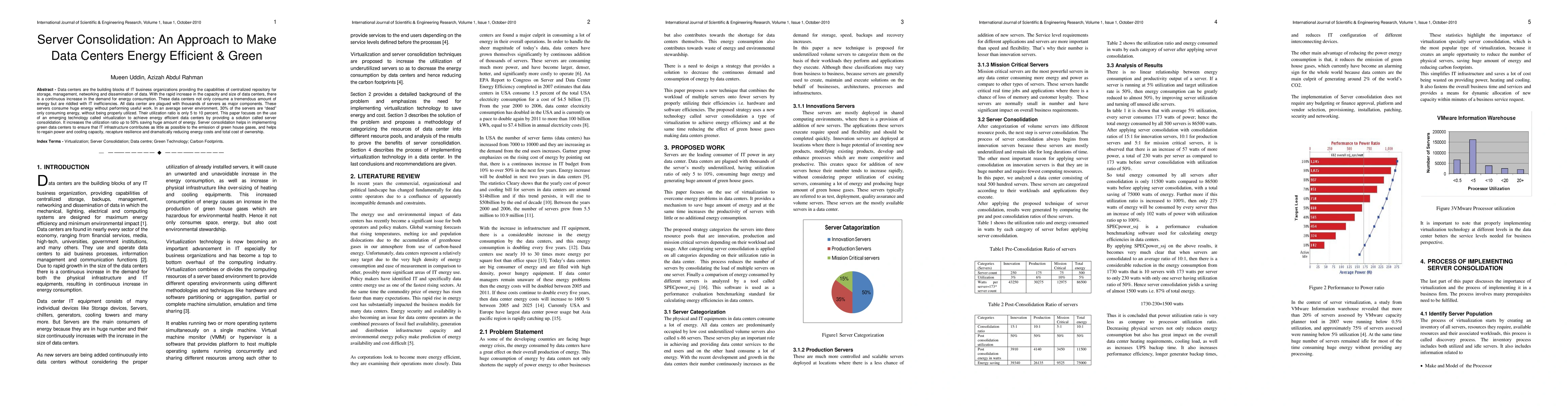 This paper explores server consolidation via virtualization to enhance data center energy efficiency and sustainability, achieving up to a 50% increase in server utilization and significantly reducing greenhouse gas emissions and operational costs.
