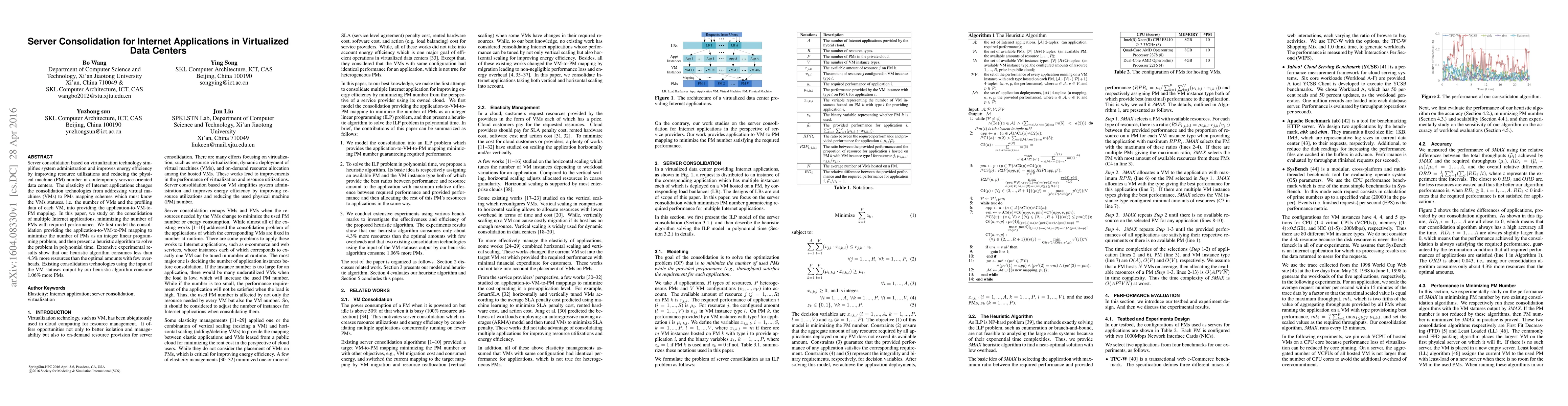 Server consolidation based on virtualization technology simplifies system administration and improves energy efficiency by improving resource utilizations and reducing the physical machine (PM) number in contemporary service-oriented data centers. The elasticity of Internet applications changes the consolidation technologies from addressing virtual machines (VMs) to PMs mapping schemes which must know the VMs statuses, i.e. the number of VMs and the profiling data of each VM, into providing the application-to-VM-to-PM mapping. In this paper, we study on the consolidation of multiple Internet applications, minimizing the number of PMs with required performance. We first model the consolidation providing the application-to-VM-to-PM mapping to minimize the number of PMs as an integer linear programming problem, and then present a heuristic algorithm to solve the problem in polynomial time. Extensive experimental results show that our heuristic algorithm consumes less than 4.3% more resources than the optimal amounts with few overheads. Existing consolidation technologies using the input of the VM statuses output by our heuristic algorithm consume 1.06% more PMs.