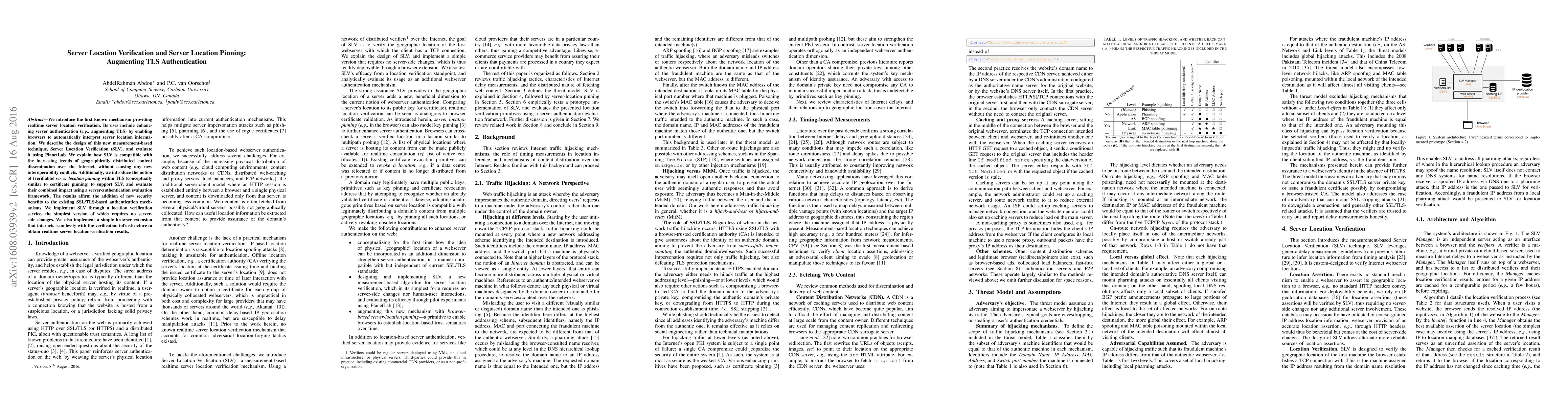 This paper introduces Server Location Verification (SLV), a mechanism for real-time server location verification to enhance TLS authentication, and proposes server location pinning to support SLV. The authors evaluate SLV using PlanetLab and demonstrate its compatibility with geographically distributed content, affirming its security benefits.