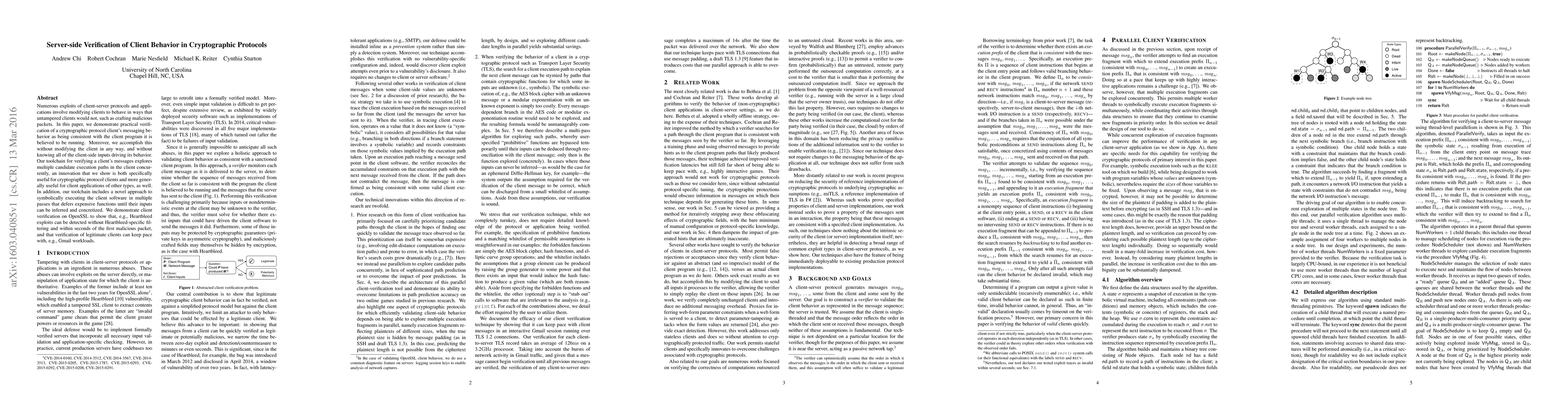 This paper presents a method for server-side verification of client behavior in cryptographic protocols by exploring multiple execution paths concurrently without modifying the client. The toolchain symbolically executes the client software in multiple passes, detecting malicious activities like Heartbleed exploits within seconds and verifying legitimate clients at a pace suitable for high-workload applications like Gmail.