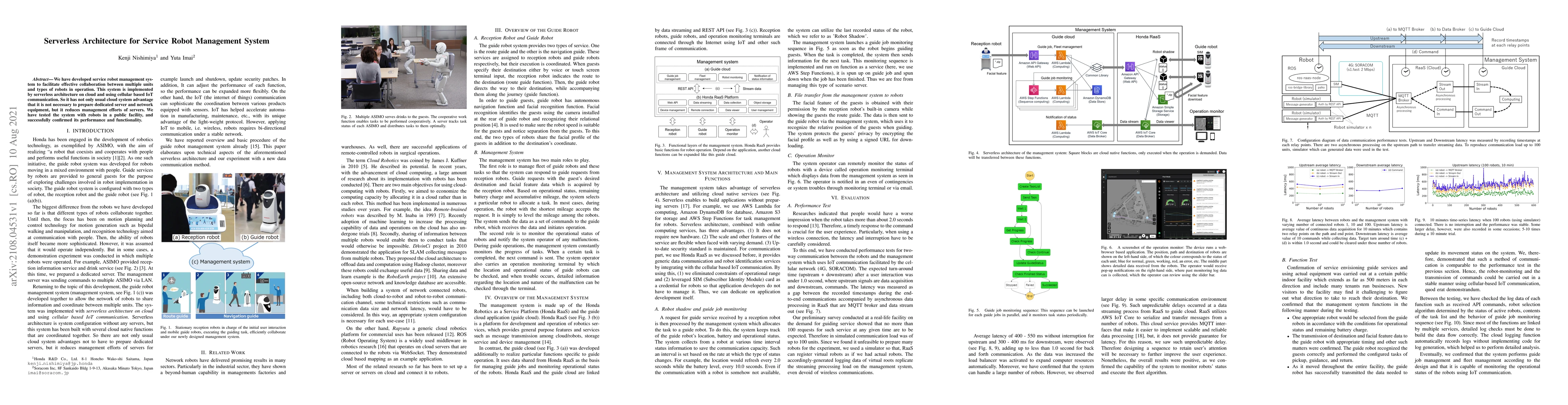 This research presents a serverless architecture for managing service robots, leveraging cloud-based IoT communication to reduce server management efforts. Tests in a public facility confirmed the system's effective performance and functionality.