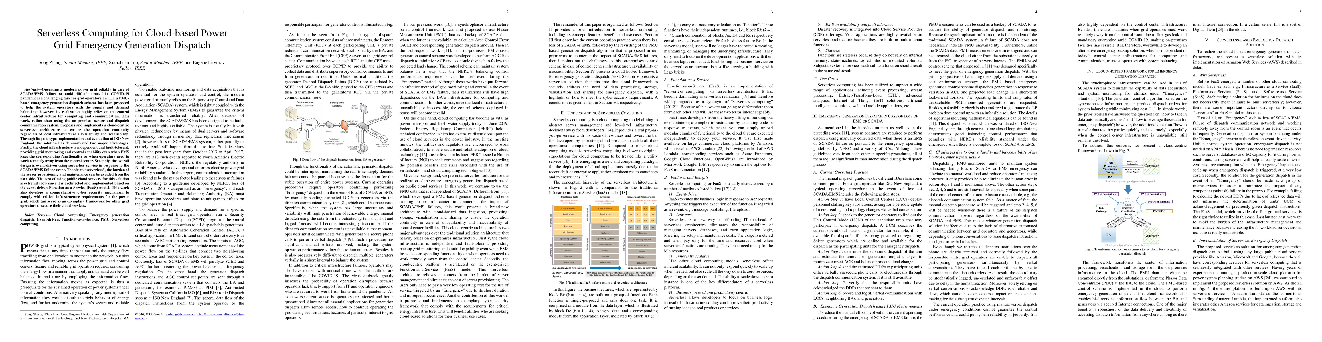 Operating a modern power grid reliably in case of SCADA/EMS failure or amid difficult times like COVID-19 pandemic is a challenging task for grid operators. In [11], a PMU-based emergency generation dispatch scheme has been proposed to help the system operators with the supply and demand balancing; however, its realization highly relies on the control center infrastructure for computing and communication. This work, rather than using the on-premises server and dispatch communication system, proposes and implements a cloud-centric serverless architecture to ensure the operation continuity regardless of local infrastructure's availability and accessibility. Through its prototype implementation and evaluation at ISO New England, the solution has demonstrated two major advantages. Firstly, the cloud infrastructure is independent and fault-tolerant, providing grid monitoring and control capability even when EMS loses the corresponding functionality or when operators need to work remotely away from the control center. Secondly, the overall design is event-driven using serverless cloud services in response to the SCADA/EMS failure event. Thanks to "serverless", the burden of the server provisioning and maintenance can be avoided from the user side. The cost of using public cloud services for this solution is extremely low since it is architected and implemented based on the event-driven Function-as-a-Service (FaaS) model. This work also develops a comprehensive cyber security mechanism to comply with critical infrastructure requirements for the power grid, which can serve as an exemplary framework for other grid operators to secure their cloud services.