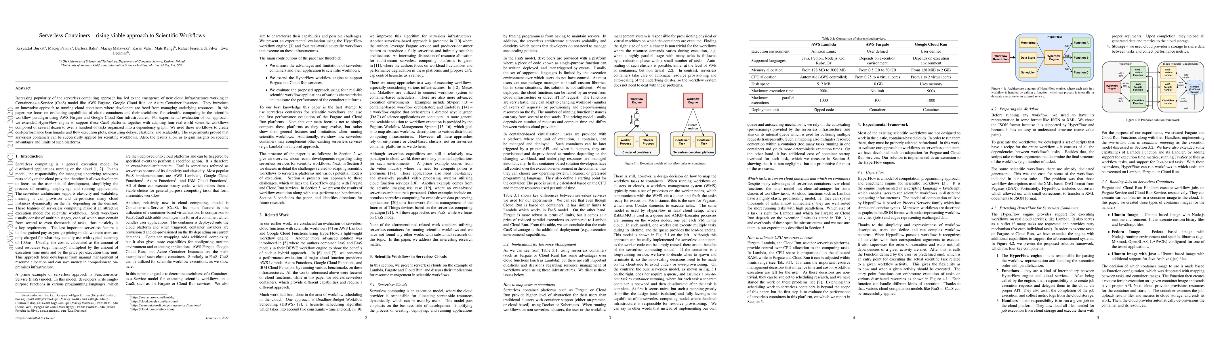Increasing popularity of the serverless computing approach has led to the emergence of new cloud infrastructures working in Container-as-a-Service (CaaS) model like AWS Fargate, Google Cloud Run, or Azure Container Instances. They introduce an innovative approach to running cloud containers where developers are freed from managing underlying resources. In this paper, we focus on evaluating capabilities of elastic containers and their usefulness for scientific computing in the scientific workflow paradigm using AWS Fargate and Google Cloud Run infrastructures. For experimental evaluation of our approach, we extended HyperFlow engine to support these CaaS platform, together with adapting four real-world scientific workflows composed of several dozen to over a hundred of tasks organized into a dependency graph. We used these workflows to create cost-performance benchmarks and flow execution plots, measuring delays, elasticity, and scalability. The experiments proved that serverless containers can be successfully applied for scientific workflows. Also, the results allow us to gain insights on specific advantages and limits of such platforms.