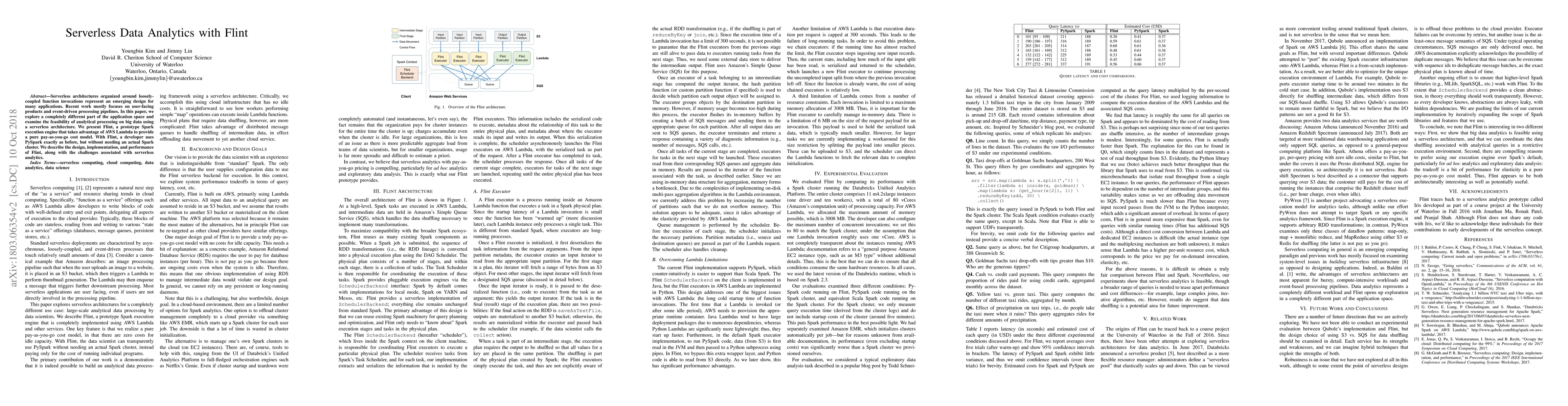 This paper introduces Flint, a serverless Spark execution engine leveraging AWS Lambda for big data analytics, enabling pay-as-you-go costs without requiring a dedicated Spark cluster. The authors discuss the design, implementation, and performance challenges of serverless data analytics.