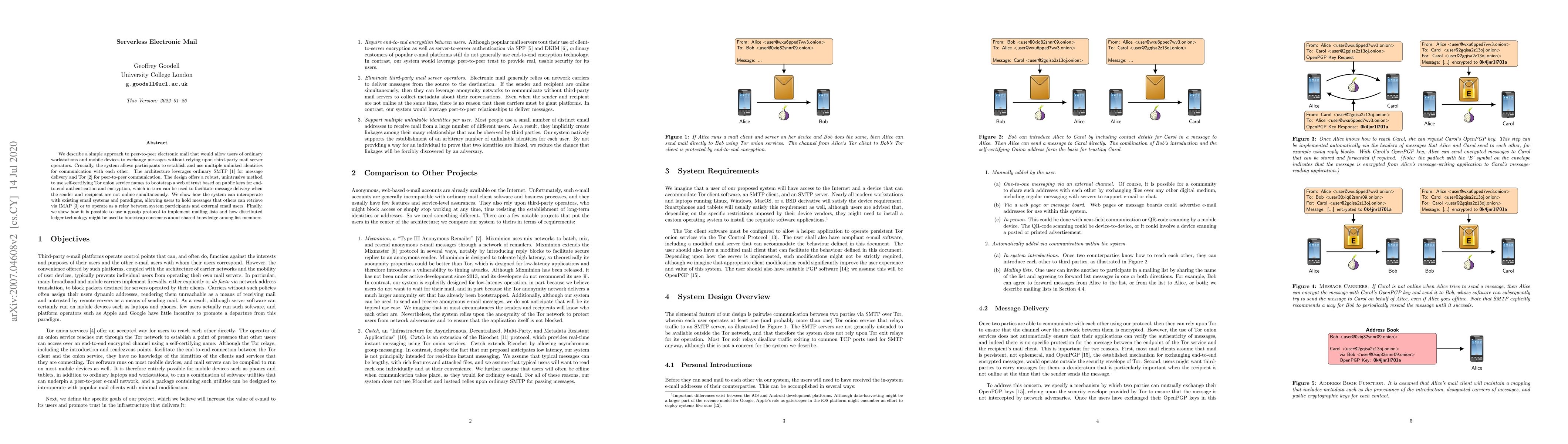 This paper proposes a serverless peer-to-peer email system using SMTP for delivery and Tor for communication, enabling users to exchange messages without third-party servers and manage multiple identities. It integrates self-certifying Tor onion services for a web of trust based on public keys, and explores interoperability with existing email systems and the use of distributed ledgers for consensus.