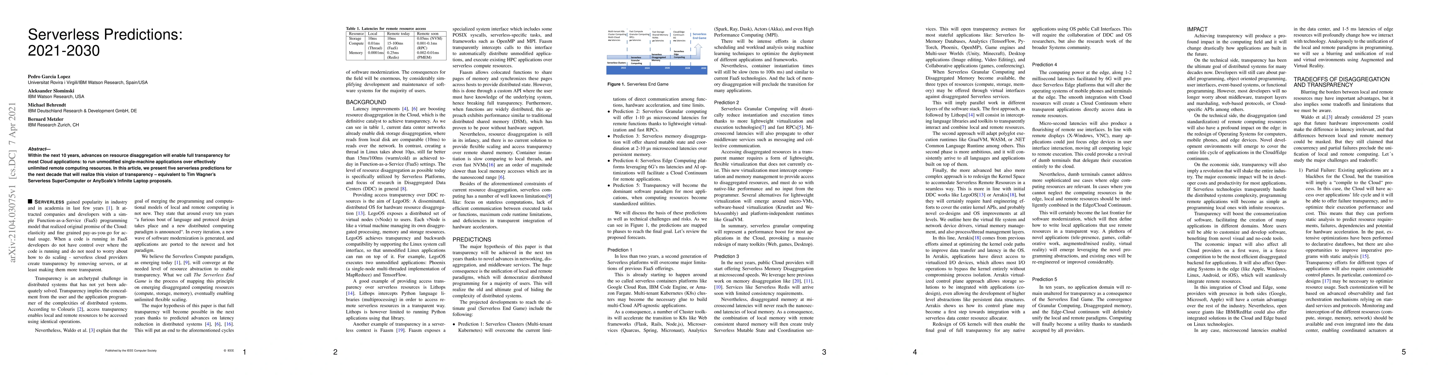 The paper presents predictions based on advances in networking, resource disaggregation, and middleware services, aiming to achieve transparency in serverless computing within the next decade.