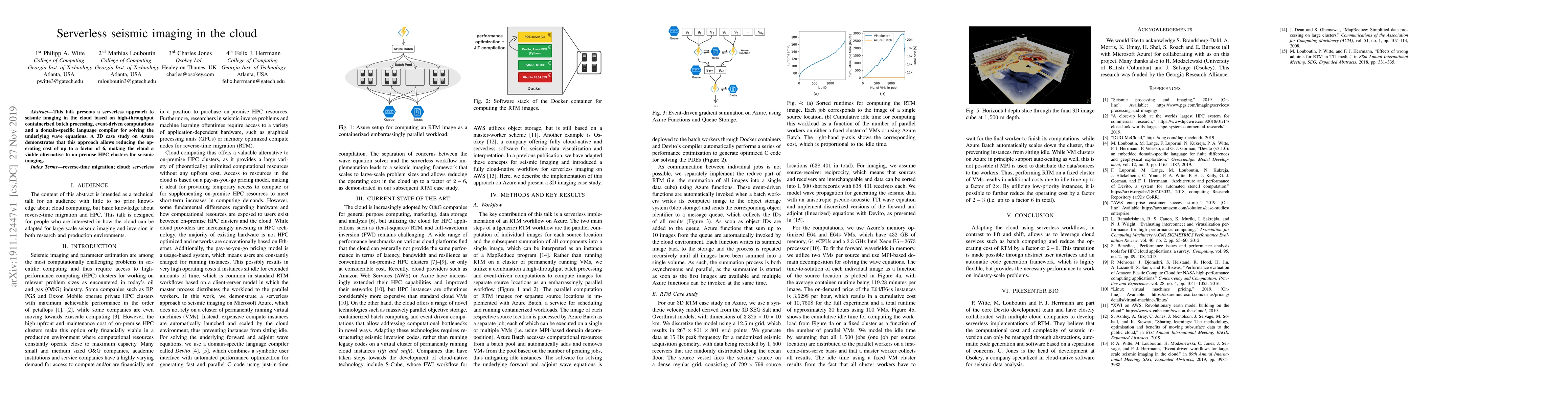 This abstract presents a serverless approach to seismic imaging in the cloud based on high-throughput containerized batch processing, event-driven computations and a domain-specific language compiler for solving the underlying wave equations. A 3D case study on Azure demonstrates that this approach allows reducing the operating cost of up to a factor of 6, making the cloud a viable alternative to on-premise HPC clusters for seismic imaging.