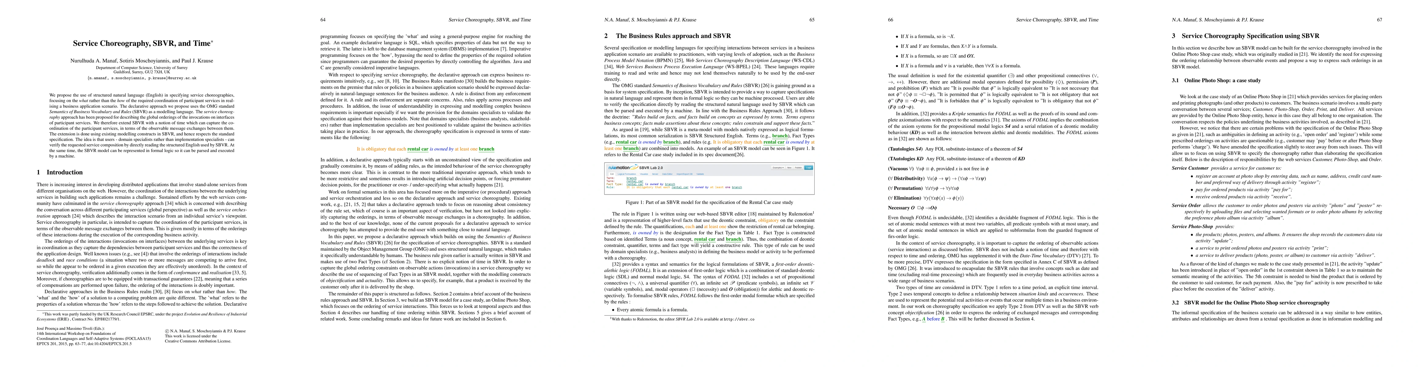 Researchers propose using SBVR to specify service choreographies with time, allowing domain specialists to verify service compositions through structured English. This enables machine-executable models for automated verification and execution of service orchestrations.