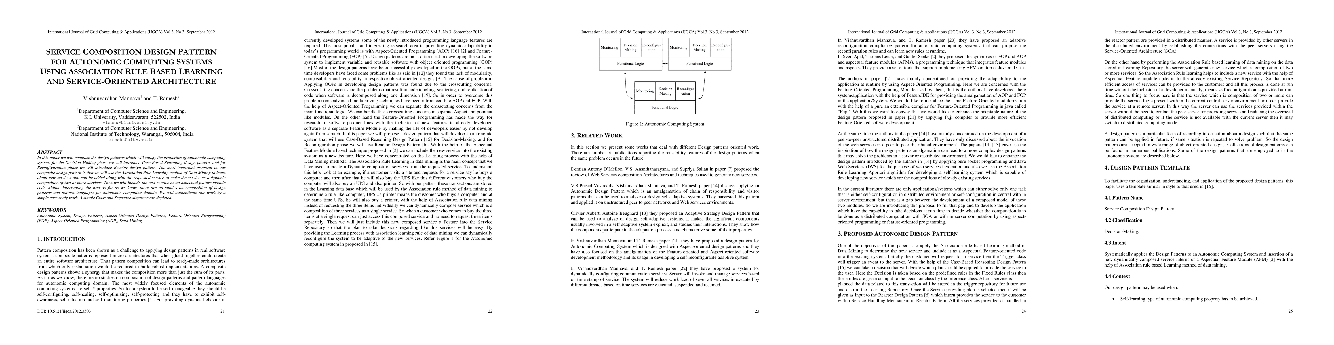 This paper introduces a Service Composition Design Pattern for autonomic computing systems in unstructured peer-to-peer networks, utilizing association rule-based learning and Service-Oriented Architecture (SOA). The pattern dynamically reconfigures itself to handle service failures without administrator intervention, employing a combination of design patterns and SOA principles.