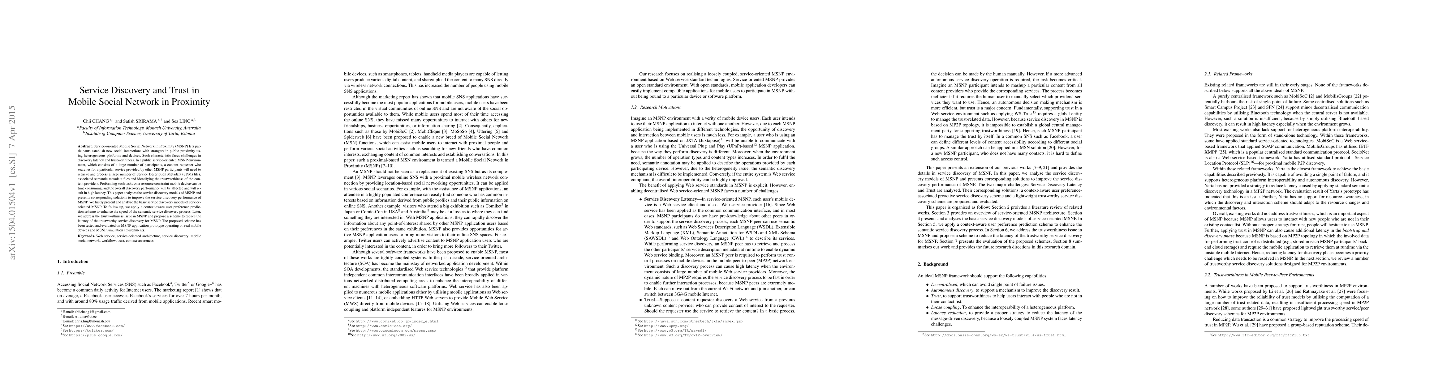 This paper examines service discovery challenges in Mobile Social Network in Proximity (MSNP) and proposes solutions to enhance discovery speed and trustworthiness. It introduces context-aware user preference prediction to speed up semantic discovery and a scheme to reduce latency in trustworthy service discovery, validated through prototype testing and simulations.