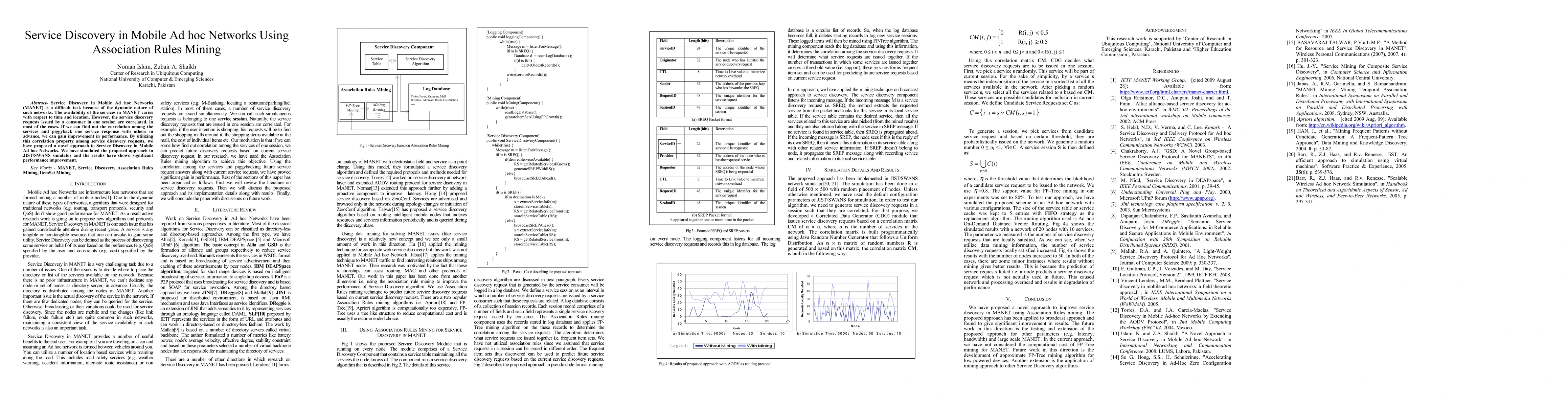 Summary: This paper introduces a novel method for Service Discovery in Mobile Ad hoc Networks using association rules mining, demonstrating significant performance improvements through simulations in the JIST/SWANS simulator.