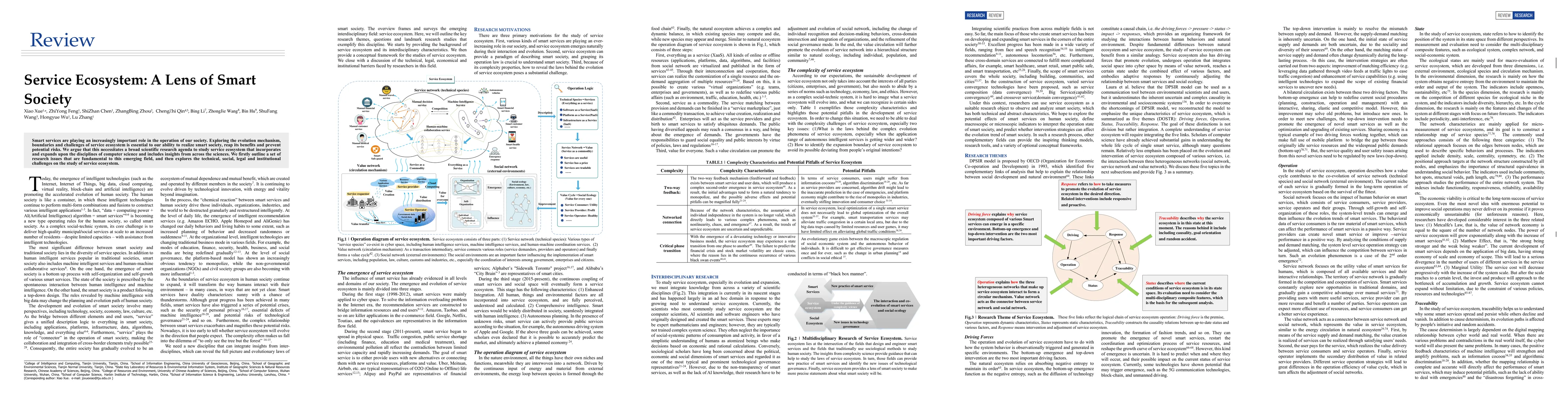 Intelligence services are playing an increasingly important role in the operation of our society. Exploring the evolution mechanism, boundaries and challenges of service ecosystem is essential to our ability to realize smart society, reap its benefits and prevent potential risks. We argue that this necessitates a broad scientific research agenda to study service ecosystem that incorporates and expands upon the disciplines of computer science and includes insights from across the sciences. We firstly outline a set of research issues that are fundamental to this emerging field, and then explores the technical, social, legal and institutional challenges on the study of service ecosystem.