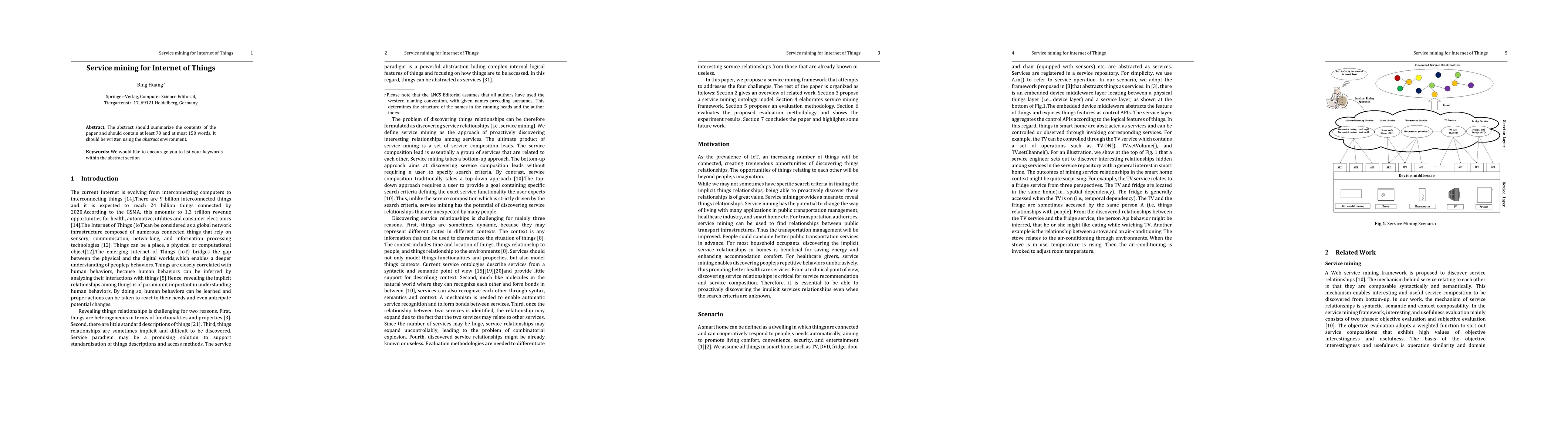 This paper proposes a service mining framework for discovering relationships in Internet of Things (IoT) services based on spatial-temporal aspects, environment, people, and operations. It introduces an ontology-based service model and metrics to evaluate the interestingness of these relationships, supported by analytical and simulation results demonstrating effectiveness.
