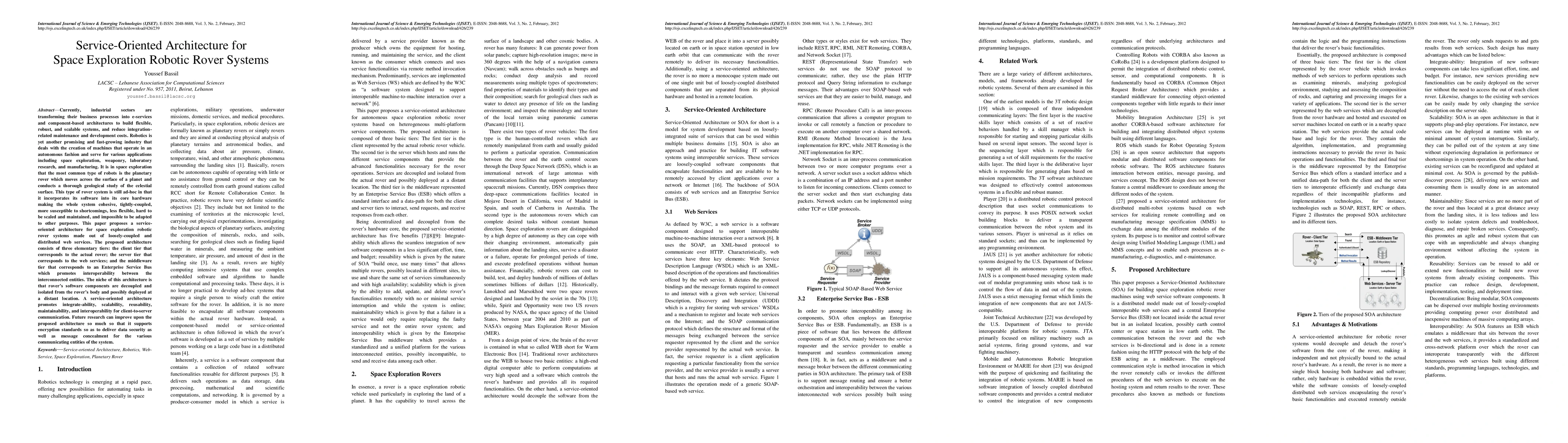 This paper proposes a service-oriented architecture for space exploration robotic rovers, featuring loosely-coupled web services to enhance flexibility, scalability, and maintainability. The architecture includes client, server, and middleware tiers, decoupling software from hardware and enabling better integration and interoperability.