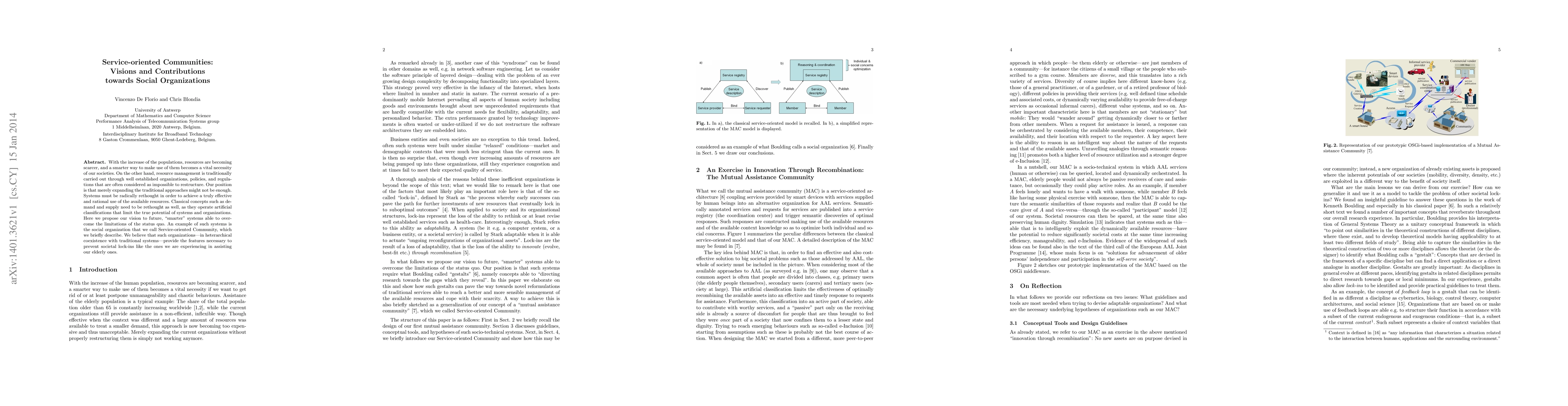 With the increase of the populations, resources are becoming scarcer, and a smarter way to make use of them becomes a vital necessity of our societies. On the other hand, resource management is traditionally carried out through well established organizations, policies, and regulations that are often considered as impossible to restructure. Our position is that merely expanding the traditional approaches might not be enough. Systems must be radically rethought in order to achieve a truly effective and rational use of the available resources. Classical concepts such as demand and supply need to be rethought as well, as they operate artificial classifications that limit the true potential of systems and organizations. In what follows we propose our vision to future, "smarter" systems able to overcome the limitations of the status quo. Such systems require what Boulding called "gestalts," namely concepts able to "directing research towards the gaps which they reveal". In this paper we elaborate on this and show how such gestalts can pave the way towards novel reformulations of traditional services able to reach a better and more sensible management of the available resources and cope with their scarcity. Our vision of a Service-oriented Community is also introduced. We believe that such communities---in heterarchical coexistence with traditional systems---provide the necessary diversity and innovation orientation to prevent societal lock-ins such as the ones we are experiencing in assisting our elderly ones.