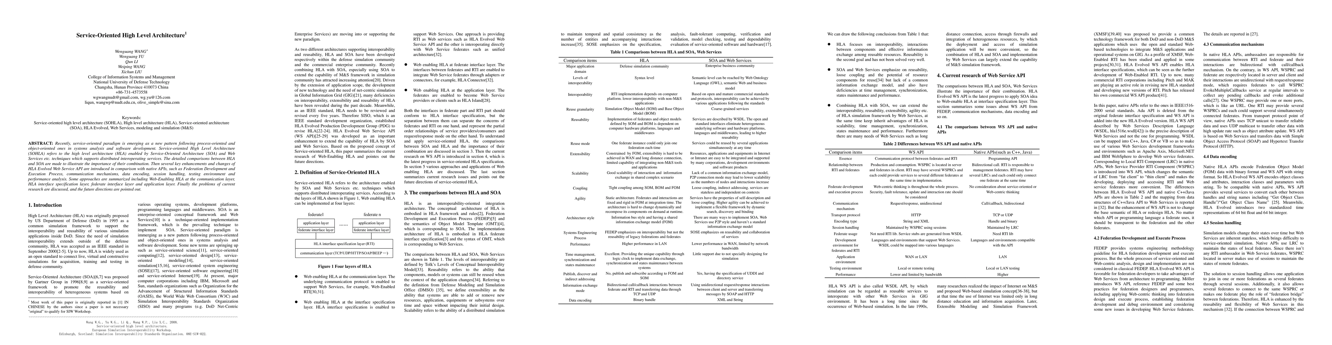 This paper discusses the Service-oriented High Level Architecture (SOHLA), which integrates Service-Oriented Architecture (SOA) with High Level Architecture (HLA) to enable interoperable distributed services. It compares HLA and SOA, highlights enhancements in HLA Evolved Web Service API, and proposes approaches for web-enabling HLA across different layers. It also identifies current research issues and suggests future directions.