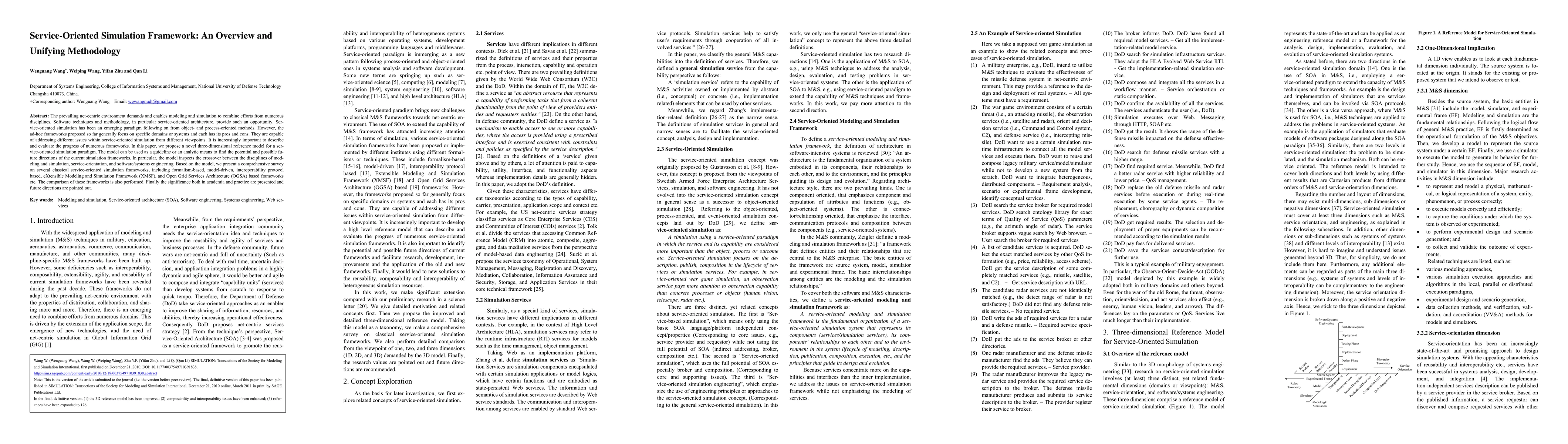 This paper introduces a three-dimensional reference model for service-oriented simulation frameworks, aiming to unify various existing ad-hoc frameworks. It surveys and compares several classical frameworks, highlighting their strengths and weaknesses, and discusses their significance and future directions in both academic and practical contexts.