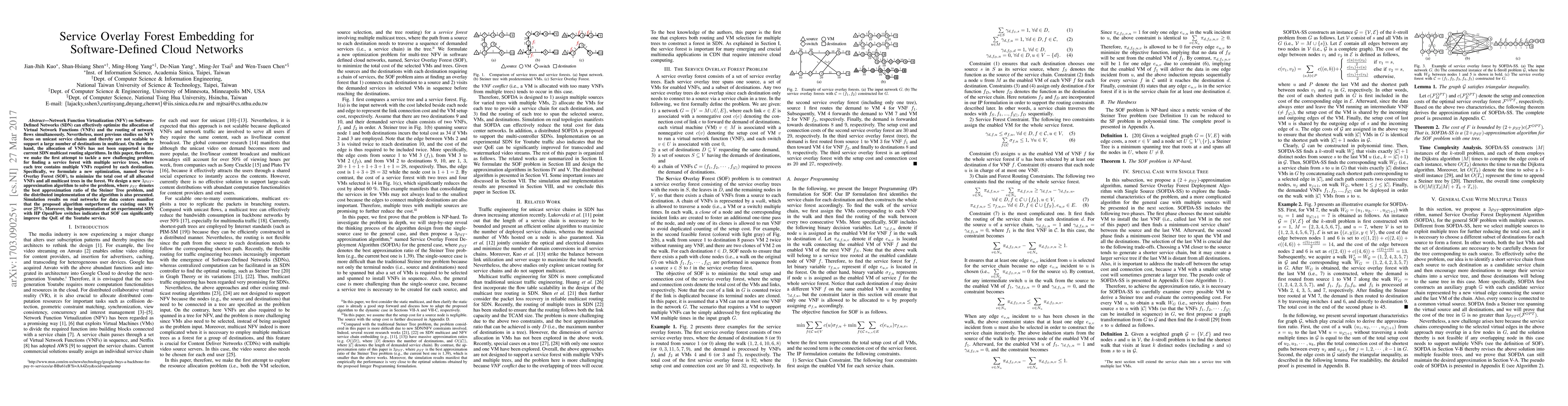 Network Function Virtualization (NFV) on Software-Defined Networks (SDN) can effectively optimize the allocation of Virtual Network Functions (VNFs) and the routing of network flows simultaneously. Nevertheless, most previous studies on NFV focus on unicast service chains and thereby are not scalable to support a large number of destinations in multicast. On the other hand, the allocation of VNFs has not been supported in the current SDN multicast routing algorithms. In this paper, therefore, we make the first attempt to tackle a new challenging problem for finding a service forest with multiple service trees, where each tree contains multiple VNFs required by each destination. Specifically, we formulate a new optimization, named Service Overlay Forest (SOF), to minimize the total cost of all allocated VNFs and all multicast trees in the forest. We design a new $3\rho_{ST}$-approximation algorithm to solve the problem, where $\rho_{ST}$ denotes the best approximation ratio of the Steiner Tree problem, and the distributed implementation of the algorithm is also presented. Simulation results on real networks for data centers manifest that the proposed algorithm outperforms the existing ones by over 25%. Moreover, the implementation of an experimental SDN with HP OpenFlow switches indicates that SOF can significantly improve the QoE of the Youtube service.
