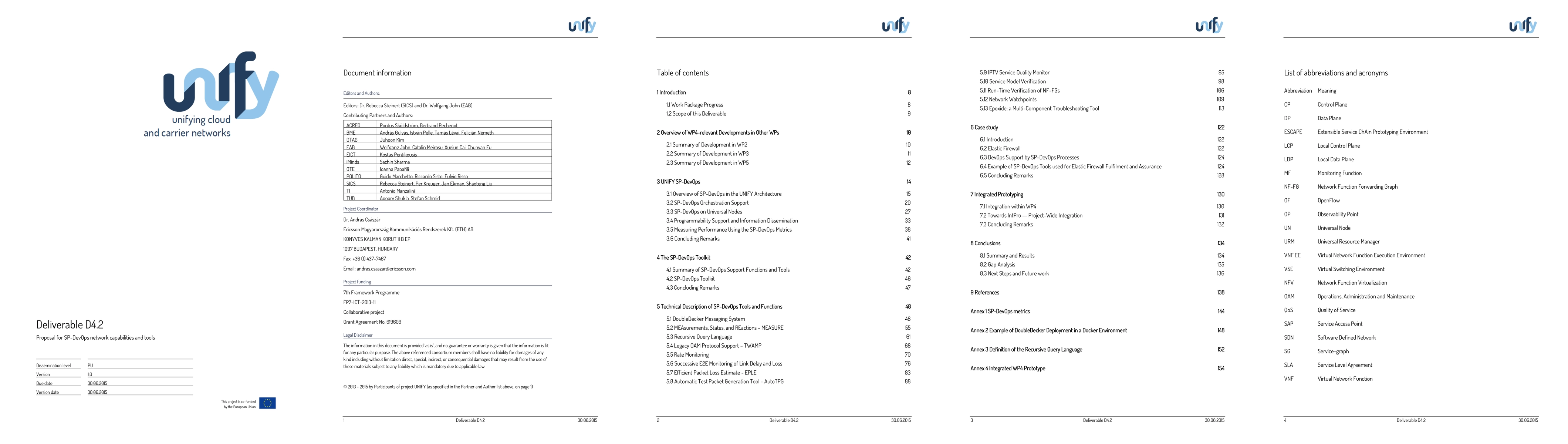 This report explores the UNIFY Service Provider (SP)-DevOps concept within a combined cloud and transport network NFV architecture, detailing novel SP-DevOps tools that enhance observability, troubleshooting, and VNF development. A case study demonstrates the practical application of these tools for deploying and scaling an Elastic Firewall.