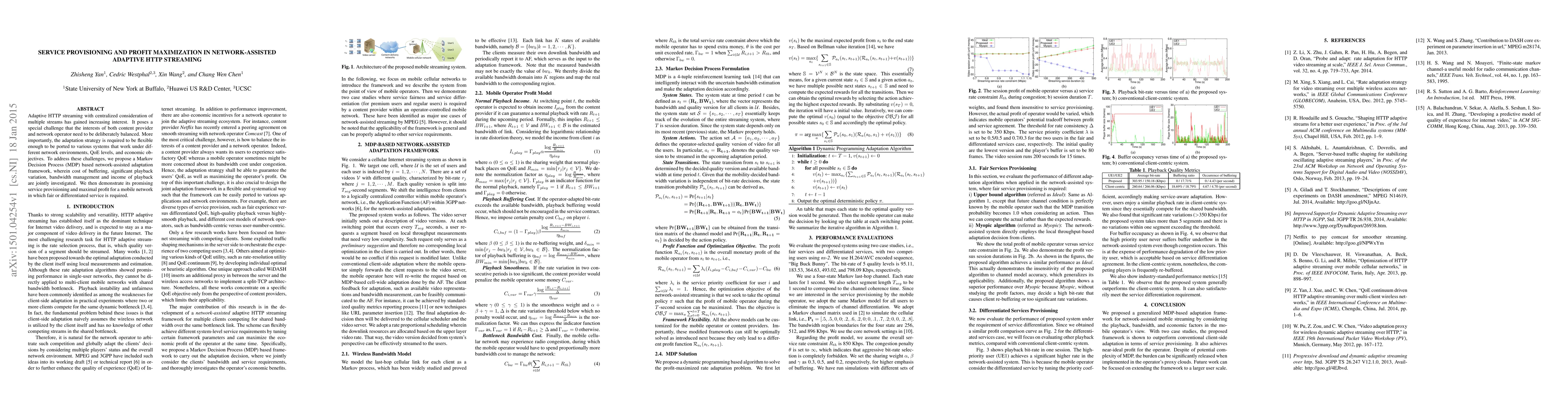 This paper proposes a Markov Decision Process (MDP) based framework for adaptive HTTP streaming that balances network operator and content provider interests. It demonstrates the framework's effectiveness in optimizing service provisioning and maximizing profit under varying network conditions and economic objectives.