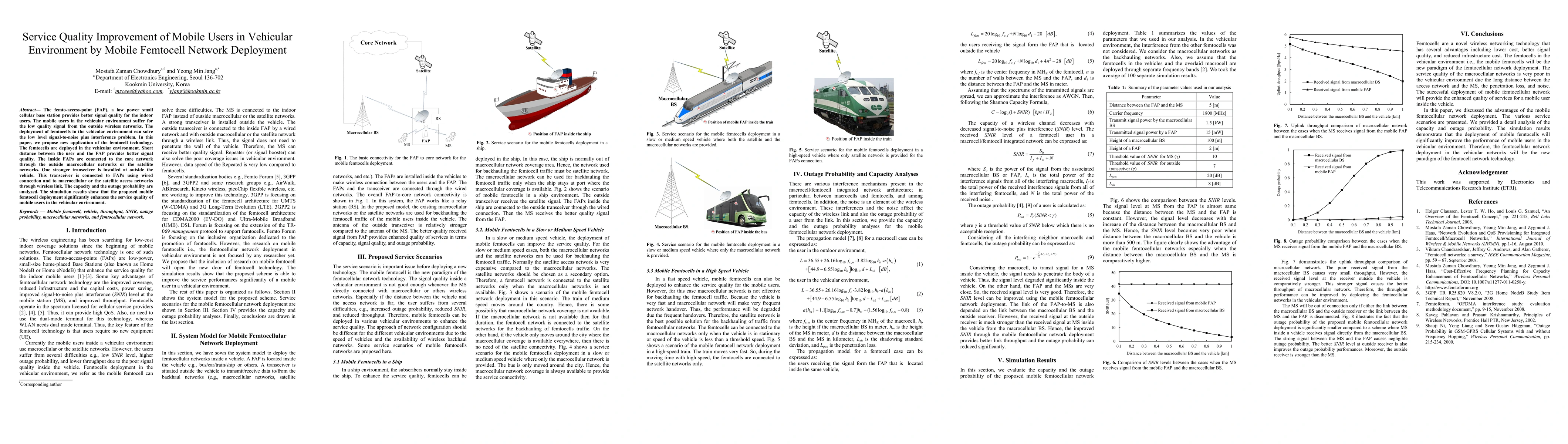 This paper proposes deploying femtocells in vehicular environments to improve mobile service quality by addressing low signal-to-noise ratio issues. Simulation results demonstrate that this approach significantly enhances signal quality and reduces outage probability for mobile users.