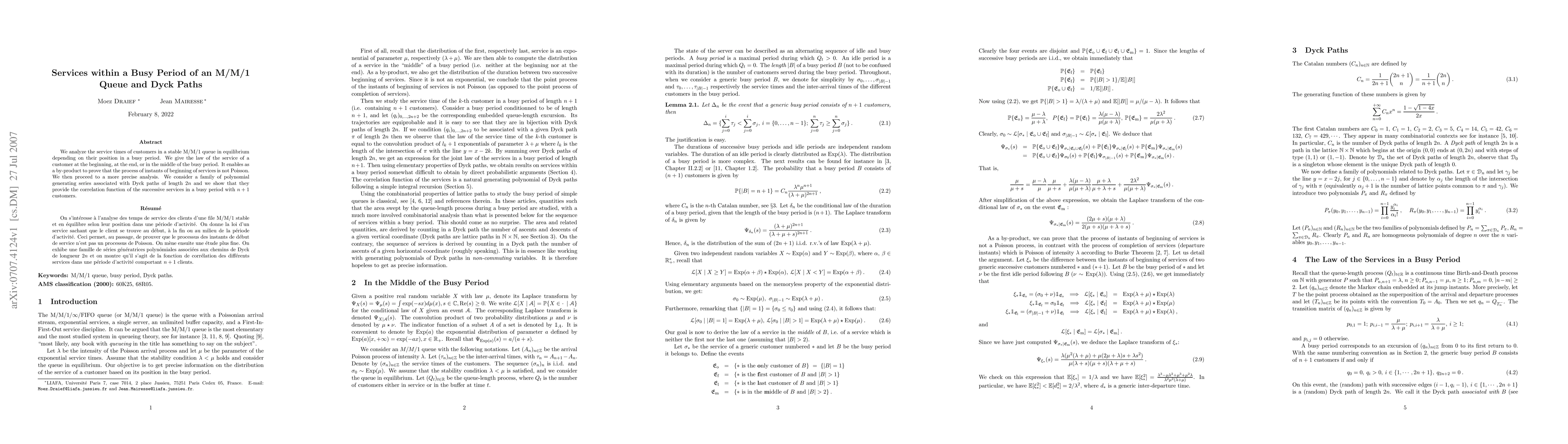 This paper examines the service times of customers in a stable M/M/1 queue during a busy period, providing the law of service for customers at different positions within the period. It also demonstrates that the process of service start times is not Poissonian and links polynomial generating series associated with Dyck paths to the correlation function of service times among n+1 customers.