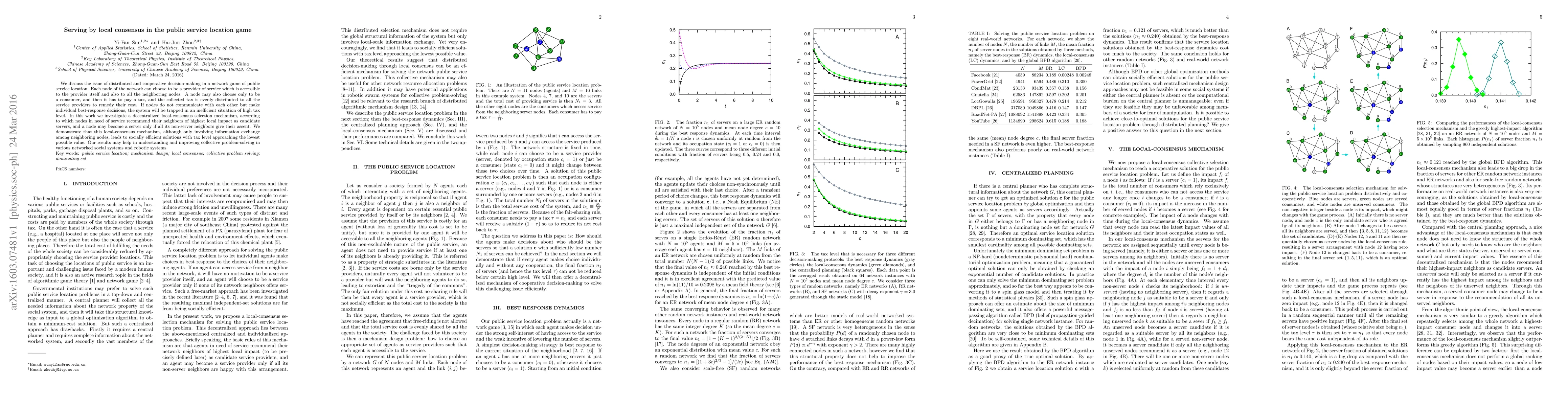 We discuss the issue of distributed and cooperative decision-making in a network game of public service location. Each node of the network can choose to be a provider of service which is accessible to the provider itself and also to all the neighboring nodes. A node may also choose only to be a consumer, and then it has to pay a tax, and the collected tax is evenly distributed to all the service providers to remedy their cost. If nodes do not communicate with each other but make individual best-response decisions, the system will be trapped in an inefficient situation of high tax level. In this work we investigate a decentralized local-consensus selection mechanism, according to which nodes in need of service recommend their neighbors of highest local impact as candidate servers, and a node may become a server only if all its non-server neighbors give their assent. We demonstrate that this local-consensus mechanism, although only involving information exchange among neighboring nodes, leads to socially efficient solutions with tax level approaching the lowest possible value. Our results may help in understanding and improving collective problem-solving in various networked social systems and robotic systems.