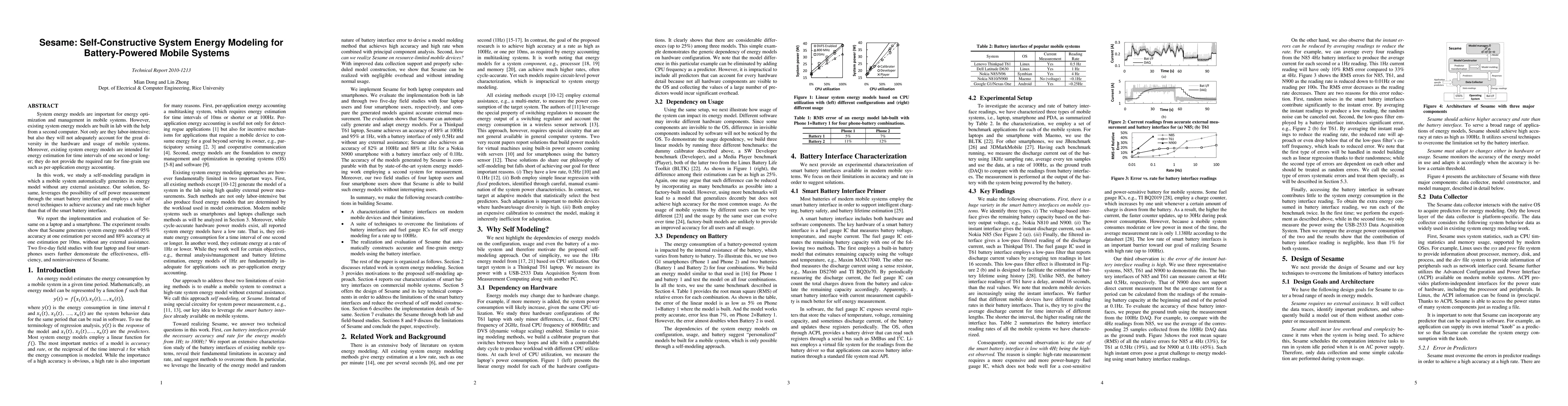 Sesame is a self-constructive system energy modeling system for battery-powered mobile devices that autonomously generates accurate energy models without external assistance. Evaluations show it achieves 95% accuracy at one-second intervals and 88% at 10ms intervals, validated through a five-day field study.