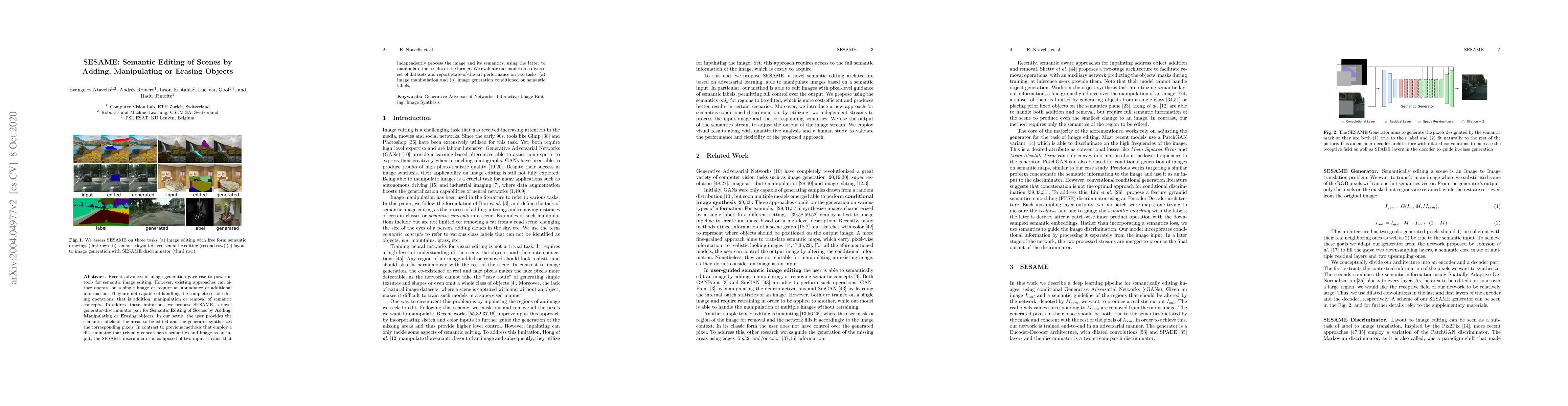 Recent advances in image generation gave rise to powerful tools for semantic image editing. However, existing approaches can either operate on a single image or require an abundance of additional information. They are not capable of handling the complete set of editing operations, that is addition, manipulation or removal of semantic concepts. To address these limitations, we propose SESAME, a novel generator-discriminator pair for Semantic Editing of Scenes by Adding, Manipulating or Erasing objects. In our setup, the user provides the semantic labels of the areas to be edited and the generator synthesizes the corresponding pixels. In contrast to previous methods that employ a discriminator that trivially concatenates semantics and image as an input, the SESAME discriminator is composed of two input streams that independently process the image and its semantics, using the latter to manipulate the results of the former. We evaluate our model on a diverse set of datasets and report state-of-the-art performance on two tasks: (a) image manipulation and (b) image generation conditioned on semantic labels.