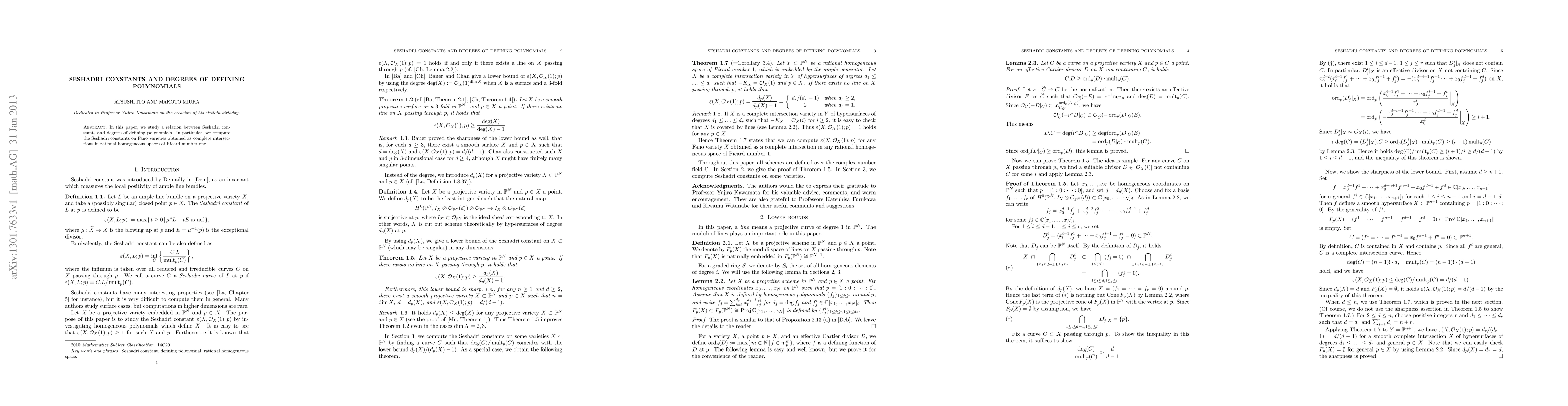 Summary: This paper investigates the connection between Seshadri constants and the degrees of defining polynomials, specifically computing Seshadri constants for Fano varieties formed as complete intersections in rational homogeneous spaces with a Picard number of one.
