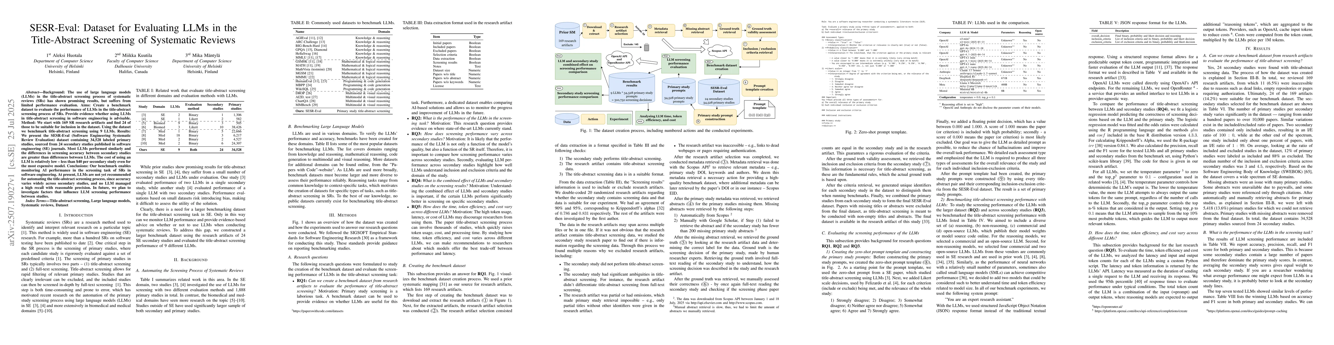 Background: The use of large language models (LLMs) in the title-abstract screening process of systematic reviews (SRs) has shown promising results, but suffers from limited performance evaluation. Aims: Create a benchmark dataset to evaluate the performance of LLMs in the title-abstract screening process of SRs. Provide evidence whether using LLMs in title-abstract screening in software engineering is advisable. Method: We start with 169 SR research artifacts and find 24 of those to be suitable for inclusion in the dataset. Using the dataset we benchmark title-abstract screening using 9 LLMs. Results: We present the SESR-Eval (Software Engineering Systematic Review Evaluation) dataset containing 34,528 labeled primary studies, sourced from 24 secondary studies published in software engineering (SE) journals. Most LLMs performed similarly and the differences in screening accuracy between secondary studies are greater than differences between LLMs. The cost of using an LLM is relatively low - less than $40 per secondary study even for the most expensive model. Conclusions: Our benchmark enables monitoring AI performance in the screening task of SRs in software engineering. At present, LLMs are not yet recommended for automating the title-abstract screening process, since accuracy varies widely across secondary studies, and no LLM managed a high recall with reasonable precision. In future, we plan to investigate factors that influence LLM screening performance between studies.