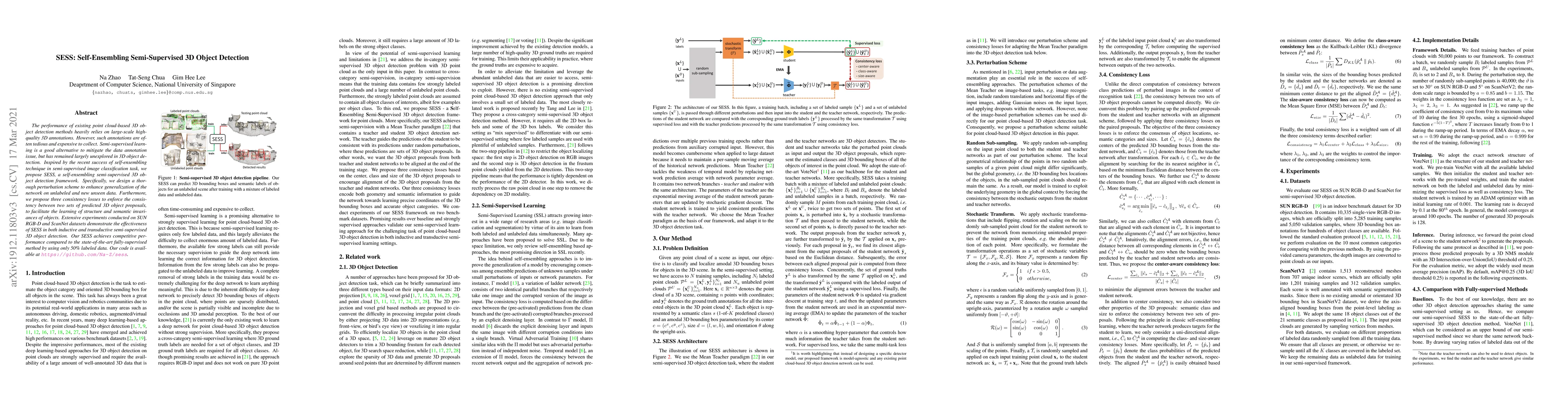 The paper introduces SESS, a self-ensembling semi-supervised framework for 3D object detection, which leverages unlabeled data to achieve competitive performance with only 50% labeled data. The method employs perturbation schemes and consistency losses to enhance generalization and learn object invariances.