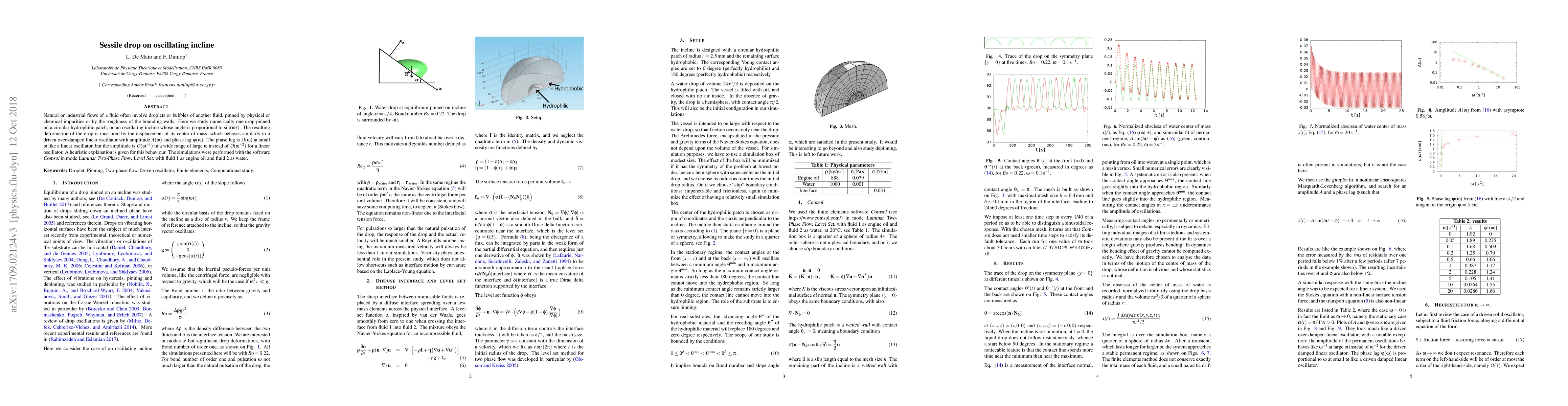 This paper numerically investigates a sessile drop on a circular hydrophilic patch on an oscillating incline, finding that the drop's center of mass behaves like a driven over-damped oscillator with unique amplitude and phase lag responses differing from typical linear oscillators. Simulations were conducted using Comsol's Laminar Two-Phase Flow, Level Set method.